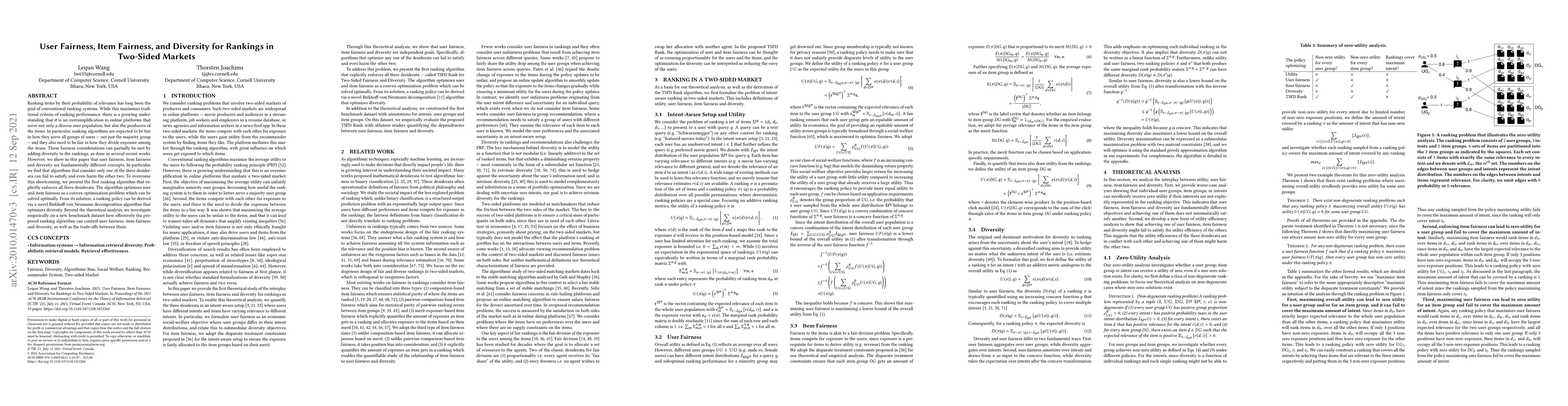 This paper introduces a novel ranking algorithm that simultaneously enforces user fairness, item fairness, and diversity in two-sided markets. It demonstrates that these fairness concepts are distinct and that algorithms focusing on only one can adversely affect the others, proposing a convex optimization approach to address all three.
