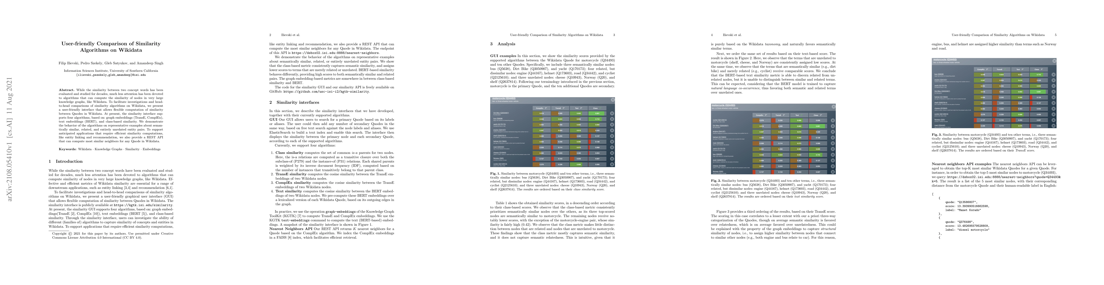 This paper introduces a user-friendly interface for comparing similarity algorithms on Wikidata, supporting four methods: TransE and ComplEx for graph embeddings, BERT for text embeddings, and class-based similarity. It demonstrates their performance on various entity pairs and provides a REST API for efficient similarity computations.