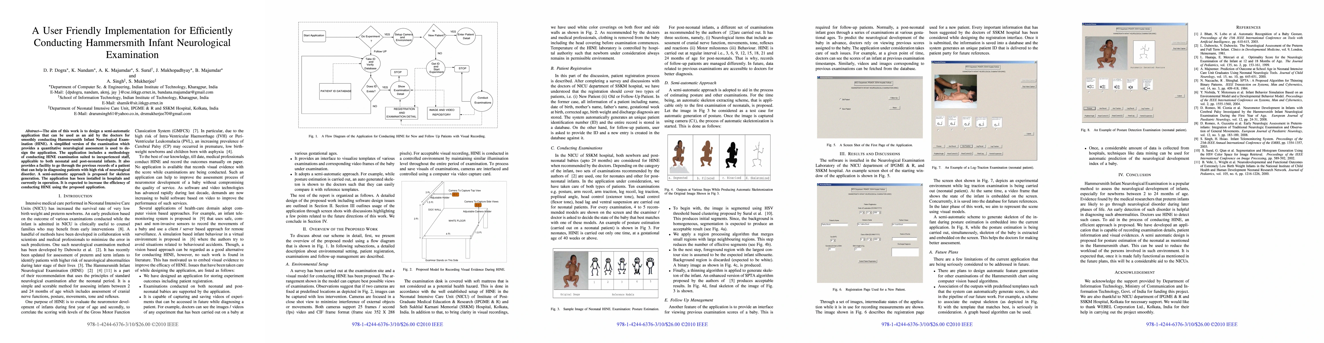 The aim of this work is to design a semi-automatic application that can be used as an aid by the doctors for smoothly conducting Hammersmith Infant Neurological Examination (IDNE). A simplified version of the examination which provides a quantitative neurological assessment is used to design the application. The application includes a methodology of conducting IDNE examination suited to inexperienced staff, applicable to both neonatal and post-neonatal infants. It also provides a facility to go through the previous records of a patient that can help in diagnosing patients with high risk of neurological disorder. A semi-automatic approach is proposed for skeleton generation. The application has been installed in hospitals and currently in operation. It is expected to increase the efficiency of conducting HINE using the proposed application.