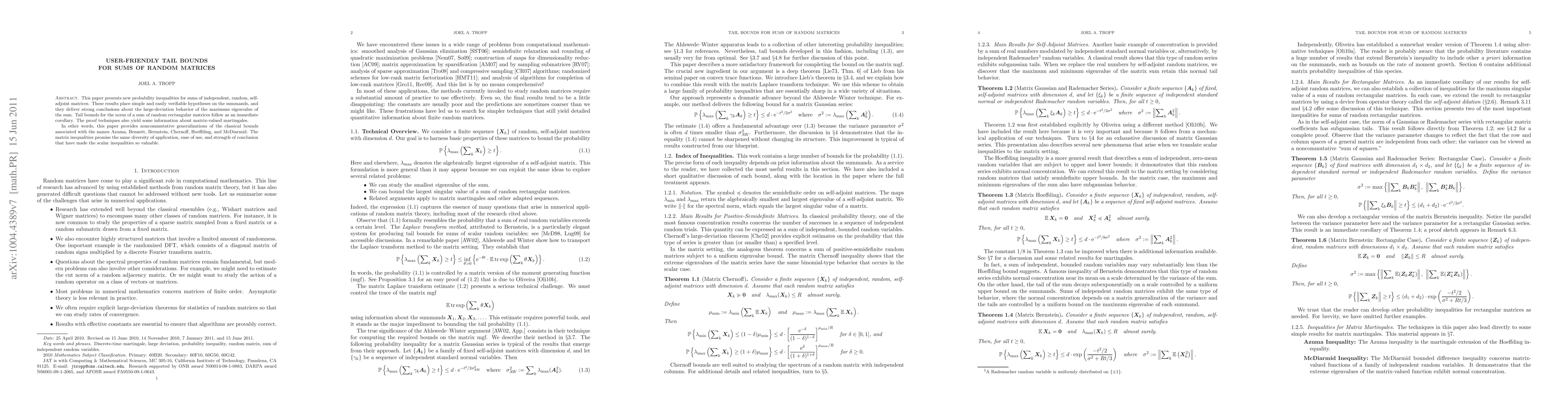 The paper presents new probability inequalities for sums of independent, random, self-adjoint matrices, providing simple and verifiable hypotheses on the summands to draw strong conclusions about the large-deviation behavior of the maximum eigenvalue of the sum.
