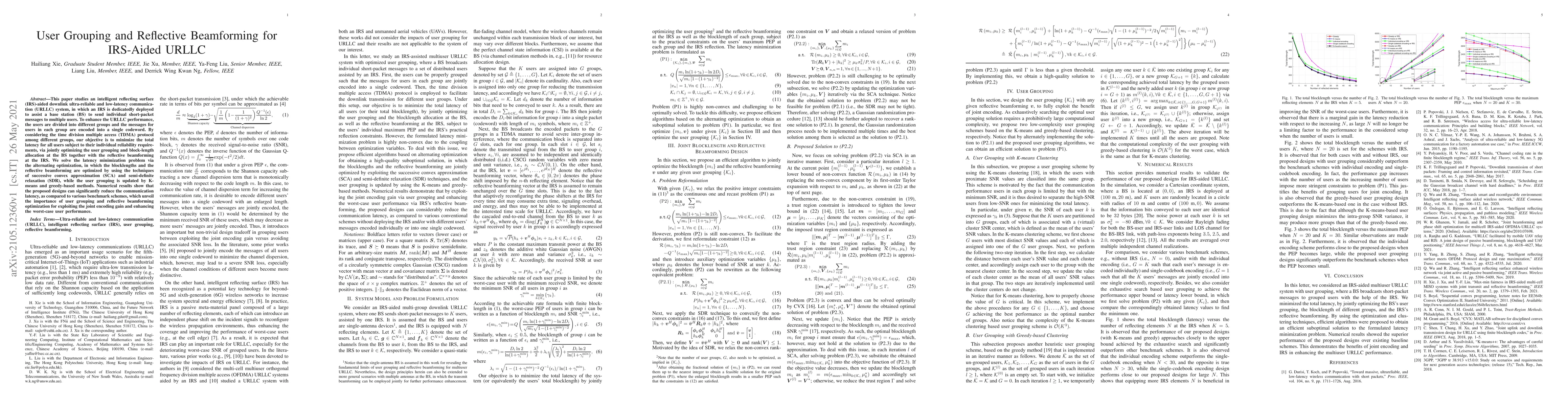 This paper proposes an IRS-aided URLLC system optimizing user grouping and reflective beamforming to minimize latency for multiple users. The solution combines user grouping, block-length allocation, and IRS beamforming optimization, achieving significant latency reduction compared to benchmark schemes.