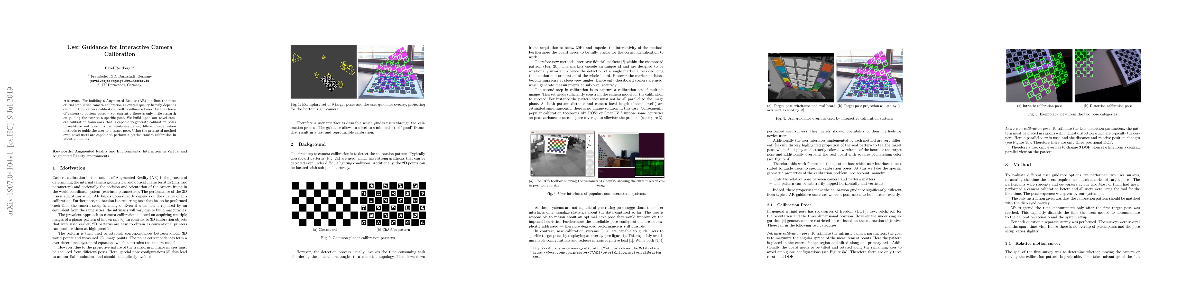 For building a Augmented Reality (AR) pipeline, the most crucial step is the camera calibration as overall quality heavily depends on it. In turn camera calibration itself is influenced most by the choice of camera-to-pattern poses - yet currently there is only little research on guiding the user to a specific pose. We build upon our novel camera calibration framework that is capable to generate calibration poses in real-time and present a user study evaluating different visualization methods to guide the user to a target pose. Using the presented method even novel users are capable to perform a precise camera calibration in about 2 minutes.