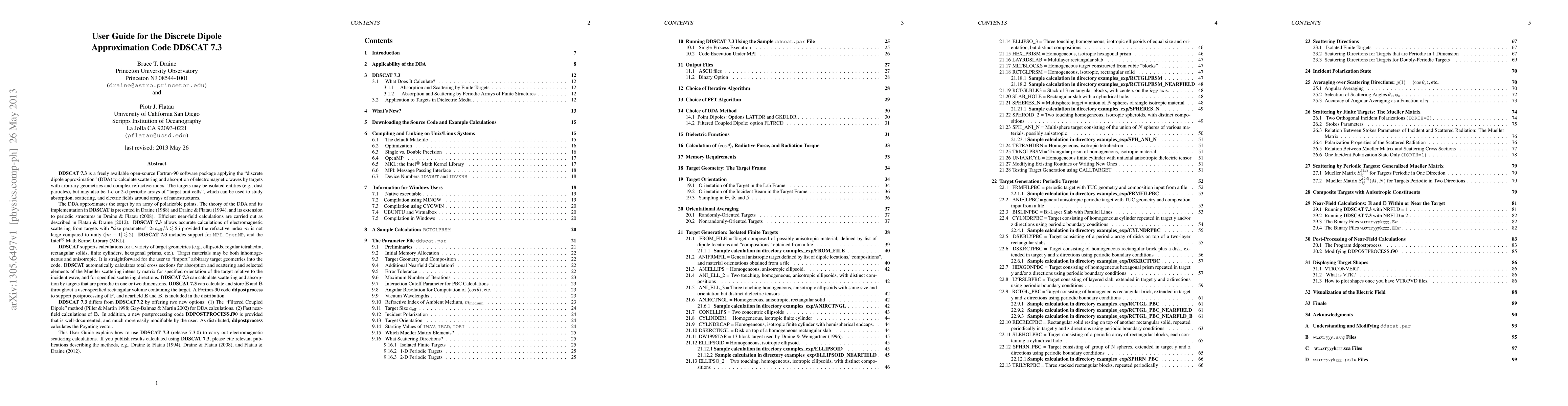 DDSCAT 7.3 is an open-source software for calculating electromagnetic scattering by targets with complex shapes and refractive indices, supporting periodic structures, inhomogeneous materials, and anisotropic properties. This user guide explains its usage, detailing improvements from version 7.2.