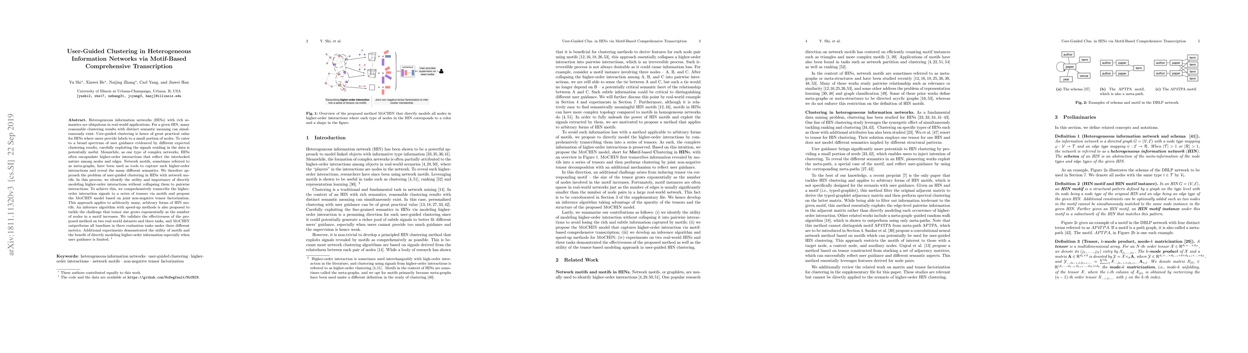Heterogeneous information networks (HINs) with rich semantics are ubiquitous in real-world applications. For a given HIN, many reasonable clustering results with distinct semantic meaning can simultaneously exist. User-guided clustering is hence of great practical value for HINs where users provide labels to a small portion of nodes. To cater to a broad spectrum of user guidance evidenced by different expected clustering results, carefully exploiting the signals residing in the data is potentially useful. Meanwhile, as one type of complex networks, HINs often encapsulate higher-order interactions that reflect the interlocked nature among nodes and edges. Network motifs, sometimes referred to as meta-graphs, have been used as tools to capture such higher-order interactions and reveal the many different semantics. We therefore approach the problem of user-guided clustering in HINs with network motifs. In this process, we identify the utility and importance of directly modeling higher-order interactions without collapsing them to pairwise interactions. To achieve this, we comprehensively transcribe the higher-order interaction signals to a series of tensors via motifs and propose the MoCHIN model based on joint non-negative tensor factorization. This approach applies to arbitrarily many, arbitrary forms of HIN motifs. An inference algorithm with speed-up methods is also proposed to tackle the challenge that tensor size grows exponentially as the number of nodes in a motif increases. We validate the effectiveness of the proposed method on two real-world datasets and three tasks, and MoCHIN outperforms all baselines in three evaluation tasks under three different metrics. Additional experiments demonstrated the utility of motifs and the benefit of directly modeling higher-order information especially when user guidance is limited.