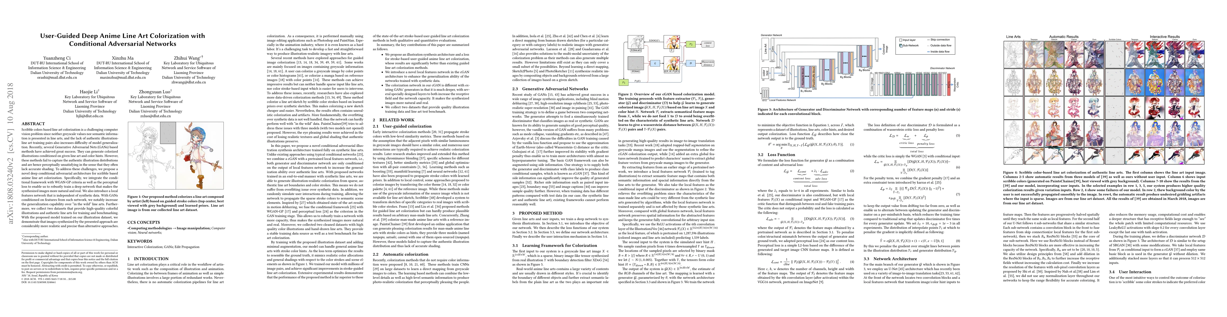 Scribble colors based line art colorization is a challenging computer vision problem since neither greyscale values nor semantic information is presented in line arts, and the lack of authentic illustration-line art training pairs also increases difficulty of model generalization. Recently, several Generative Adversarial Nets (GANs) based methods have achieved great success. They can generate colorized illustrations conditioned on given line art and color hints. However, these methods fail to capture the authentic illustration distributions and are hence perceptually unsatisfying in the sense that they often lack accurate shading. To address these challenges, we propose a novel deep conditional adversarial architecture for scribble based anime line art colorization. Specifically, we integrate the conditional framework with WGAN-GP criteria as well as the perceptual loss to enable us to robustly train a deep network that makes the synthesized images more natural and real. We also introduce a local features network that is independent of synthetic data. With GANs conditioned on features from such network, we notably increase the generalization capability over "in the wild" line arts. Furthermore, we collect two datasets that provide high-quality colorful illustrations and authentic line arts for training and benchmarking. With the proposed model trained on our illustration dataset, we demonstrate that images synthesized by the presented approach are considerably more realistic and precise than alternative approaches.