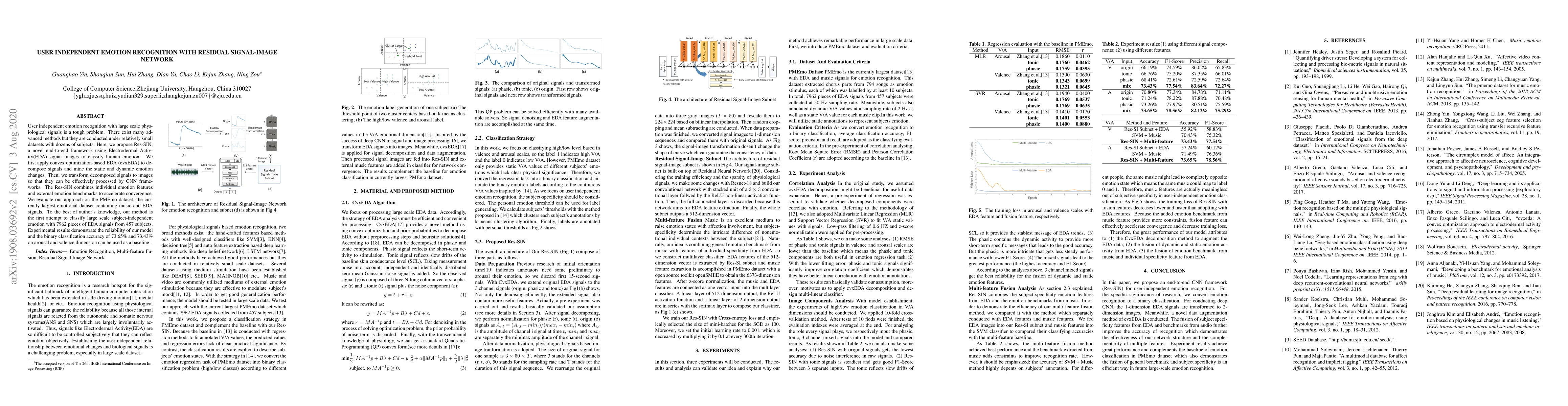 User independent emotion recognition with large scale physiological signals is a tough problem. There exist many advanced methods but they are conducted under relatively small datasets with dozens of subjects. Here, we propose Res-SIN, a novel end-to-end framework using Electrodermal Activity(EDA) signal images to classify human emotion. We first apply convex optimization-based EDA (cvxEDA) to decompose signals and mine the static and dynamic emotion changes. Then, we transform decomposed signals to images so that they can be effectively processed by CNN frameworks. The Res-SIN combines individual emotion features and external emotion benchmarks to accelerate convergence. We evaluate our approach on the PMEmo dataset, the currently largest emotional dataset containing music and EDA signals. To the best of author's knowledge, our method is the first attempt to classify large scale subject-independent emotion with 7962 pieces of EDA signals from 457 subjects. Experimental results demonstrate the reliability of our model and the binary classification accuracy of 73.65% and 73.43% on arousal and valence dimension can be used as a baseline.