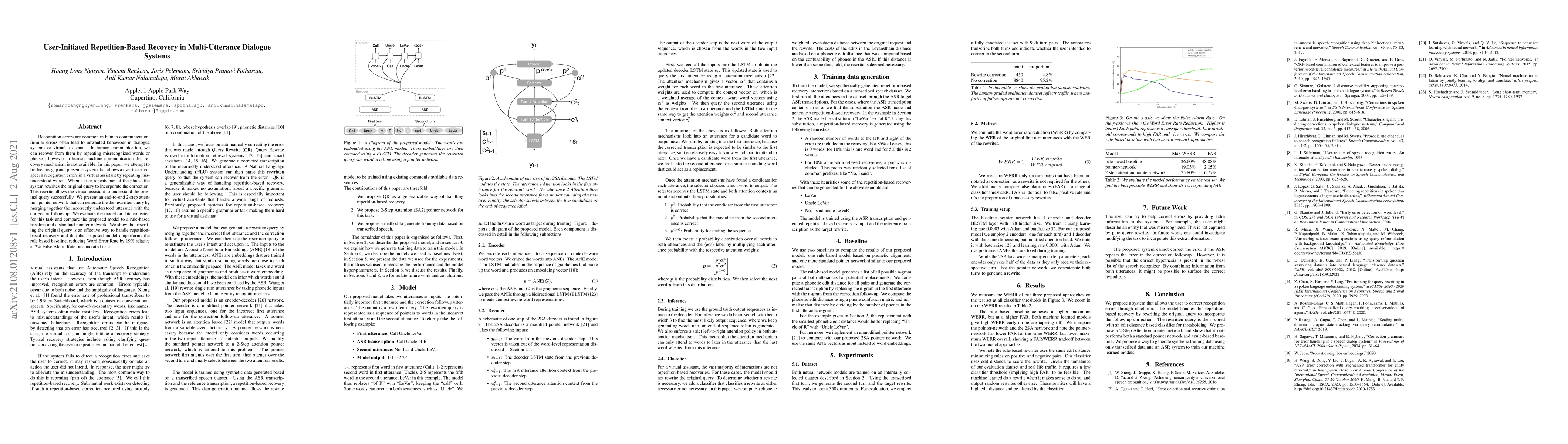Recognition errors are common in human communication. Similar errors often lead to unwanted behaviour in dialogue systems or virtual assistants. In human communication, we can recover from them by repeating misrecognized words or phrases; however in human-machine communication this recovery mechanism is not available. In this paper, we attempt to bridge this gap and present a system that allows a user to correct speech recognition errors in a virtual assistant by repeating misunderstood words. When a user repeats part of the phrase the system rewrites the original query to incorporate the correction. This rewrite allows the virtual assistant to understand the original query successfully. We present an end-to-end 2-step attention pointer network that can generate the the rewritten query by merging together the incorrectly understood utterance with the correction follow-up. We evaluate the model on data collected for this task and compare the proposed model to a rule-based baseline and a standard pointer network. We show that rewriting the original query is an effective way to handle repetition-based recovery and that the proposed model outperforms the rule based baseline, reducing Word Error Rate by 19% relative at 2% False Alarm Rate on annotated data.