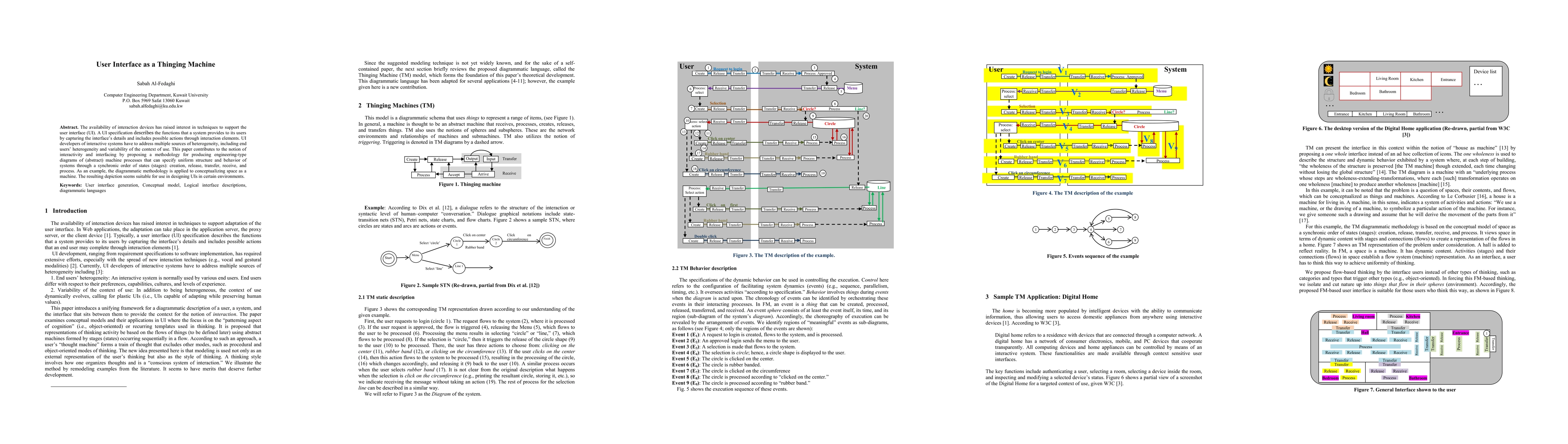 The availability of interaction devices has raised interest in techniques to support the user interface (UI). A UI specification describes the functions that a system provides to its users by capturing the interface details and includes possible actions through interaction elements. UI developers of interactive systems have to address multiple sources of heterogeneity, including end users heterogeneity and variability of the context of use. This paper contributes to the notion of interactivity and interfacing by proposing a methodology for producing engineering-type diagrams of (abstract) machine processes that can specify uniform structure and behavior of systems through a synchronic order of states (stages): creation, release, transfer, receive, and process. As an example, the diagrammatic methodology is applied to conceptualizing space as a machine. The resulting depiction seems suitable for use in designing UIs in certain environments.