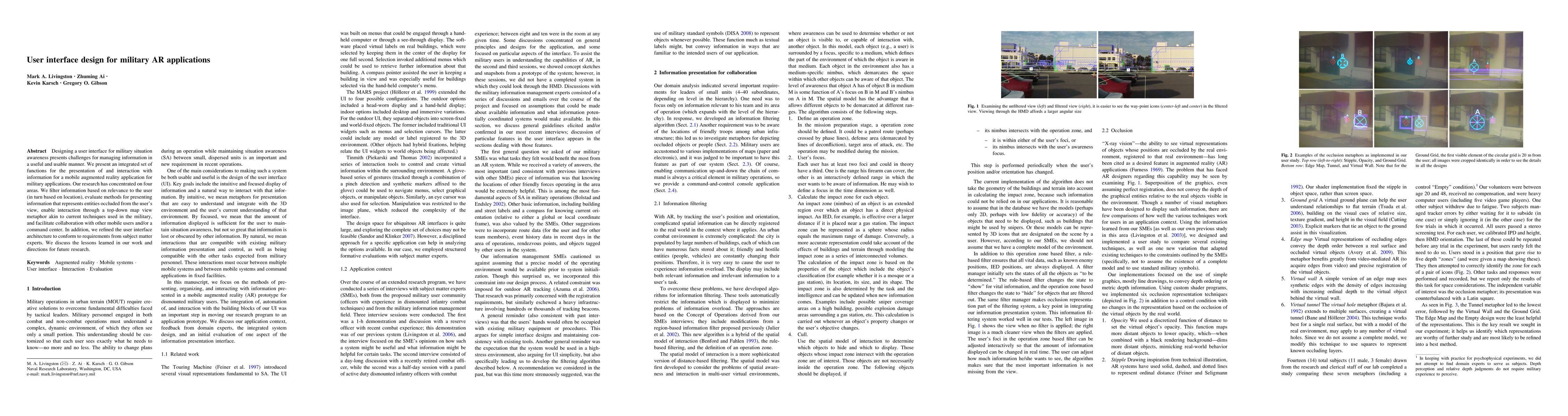 Researchers developed a user interface design for military augmented reality applications to effectively manage information in a usable manner. Their work focused on filtering information, presenting occluded entities, enabling interaction, facilitating collaboration, and refining the architecture to meet expert requirements.
