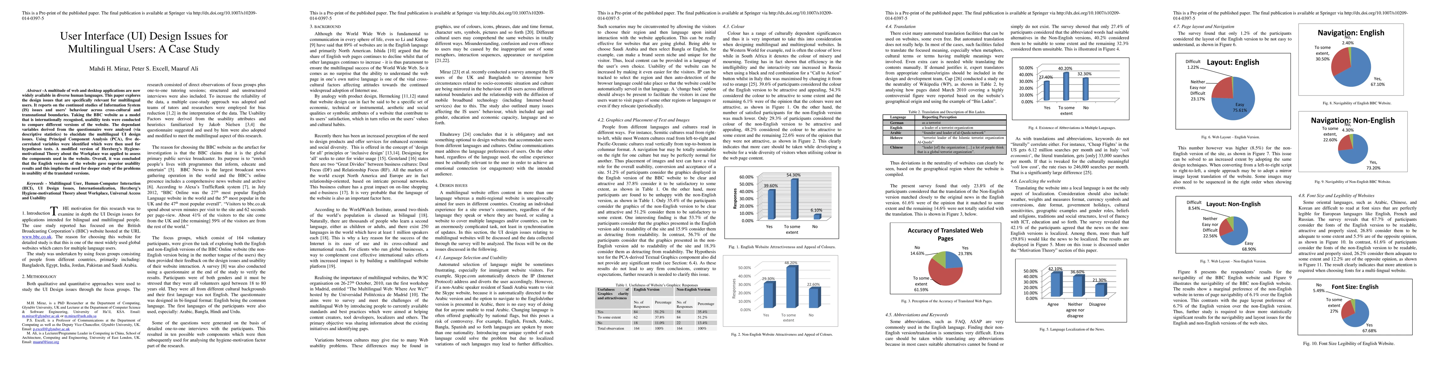 A multitude of web and desktop applications are now widely available in diverse human languages. This paper explores the design issues that are specifically relevant for multilingual users. It reports on the continued studies of Information System (IS) issues and users' behaviour across cross-cultural and transnational boundaries. Taking the BBC website as a model that is internationally recognised, usability tests were conducted to compare different versions of the website. The dependant variables derived from the questionnaire were analysed (via descriptive statistics) to elucidate the multilingual UI design issues. Using Principal Component Analysis (PCA), five de-correlated variables were identified which were then used for hypotheses tests. A modified version of Herzberg's Hygiene-motivational Theory about the Workplace was applied to assess the components used in the website. Overall, it was concluded that the English versions of the website gave superior usability results and this implies the need for deeper study of the problems in usability of the translated versions.