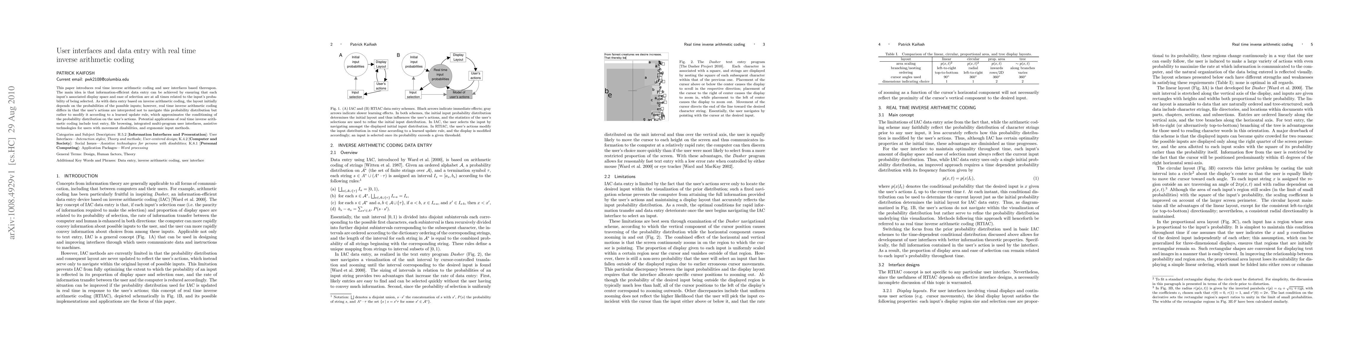 This paper introduces real time inverse arithmetic coding and user interfaces based thereupon. The main idea is that information-efficient data entry can be achieved by ensuring that each input's associated display space and ease of selection are at all times related to the input's probability of being selected. As with data entry based on inverse arithmetic coding, the layout initially depends on the probabilities of the possible inputs; however, real time inverse arithmetic coding differs in that the user's actions are interpreted not to navigate this probability distribution but rather to modify it according to a learned update rule, which approximates the conditioning of the probability distribution on the user's actions. Potential applications of real time inverse arithmetic coding include text entry, file browsing, integrated multi-program user interfaces, assistive technologies for users with movement disabilities, and ergonomic input methods.