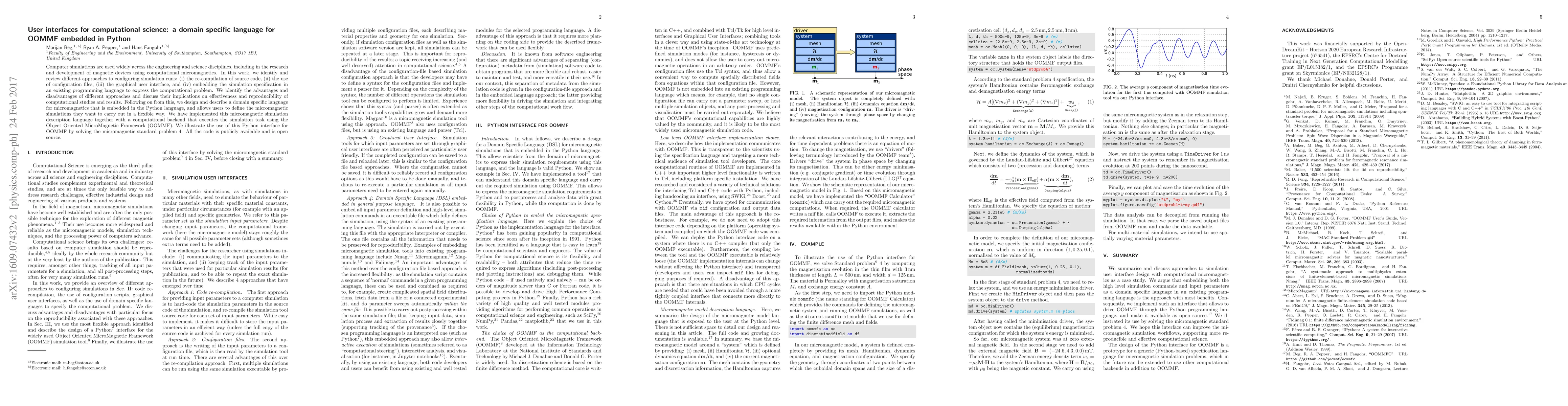 Computer simulations are used widely across the engineering and science disciplines, including in the research and development of magnetic devices using computational micromagnetics. In this work, we identify and review different approaches to configuring simulation runs: (i) the re-compilation of source code, (ii) the use of configuration files, (iii) the graphical user interface, and (iv) embedding the simulation specification in an existing programming language to express the computational problem. We identify the advantages and disadvantages of different approaches and discuss their implications on effectiveness and reproducibility of computational studies and results. Following on from this, we design and describe a domain specific language for micromagnetics that is embedded in the Python language, and allows users to define the micromagnetic simulations they want to carry out in a flexible way. We have implemented this micromagnetic simulation description language together with a computational backend that executes the simulation task using the Object Oriented MicroMagnetic Framework (OOMMF). We illustrate the use of this Python interface for OOMMF by solving the micromagnetic standard problem 4. All the code is publicly available and is open source.