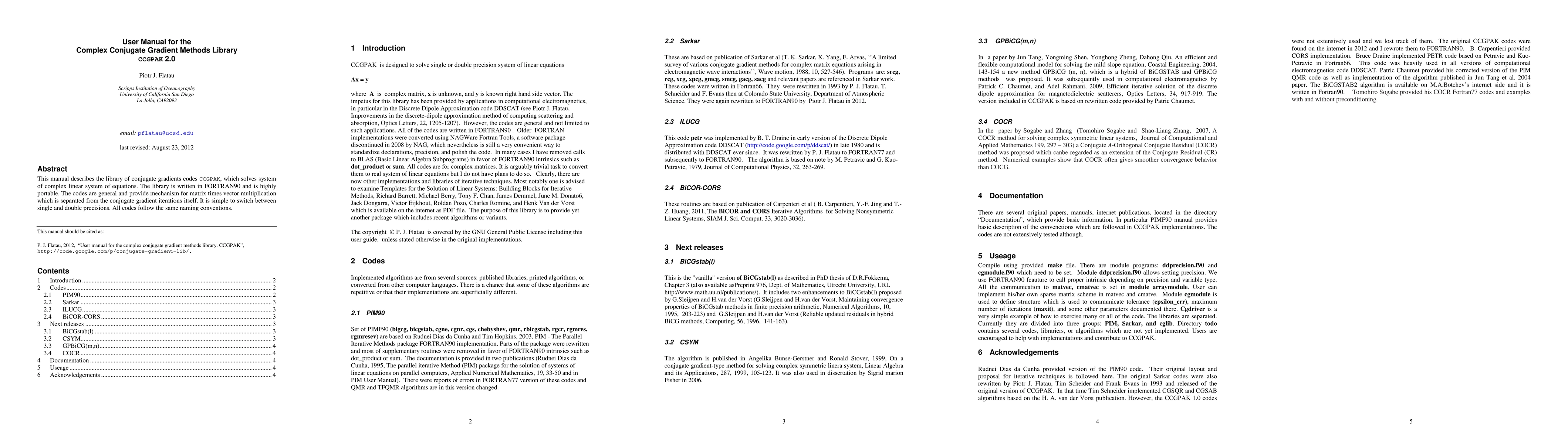 A user manual for CCGPAK 2.0 describes a highly portable library of conjugate gradient codes that solve complex linear systems of equations with general matrix-vector multiplication capabilities.