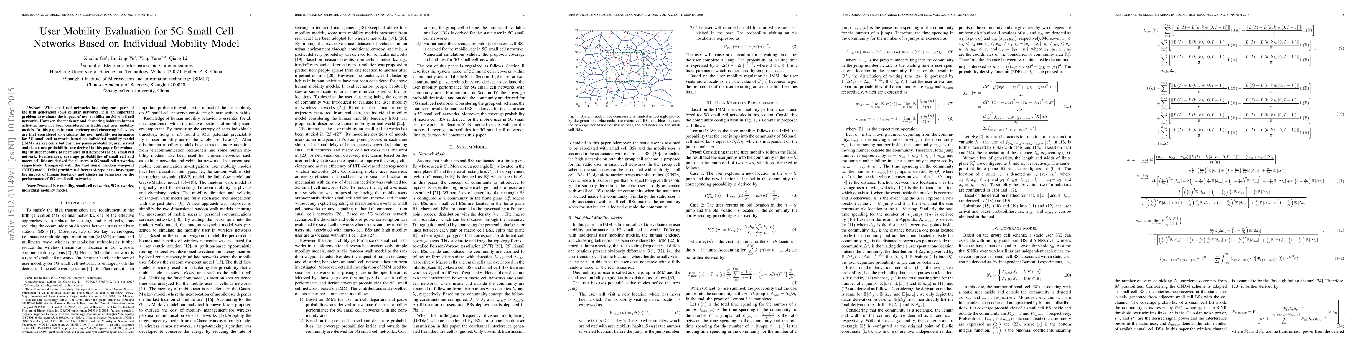 This paper evaluates user mobility in 5G small cell networks using an Individual Mobility Model (IMM) that considers human tendency and clustering behaviors. It derives user pause, arrival, and departure probabilities to assess performance in hotspot-type networks, contrasting with traditional random waypoint models.