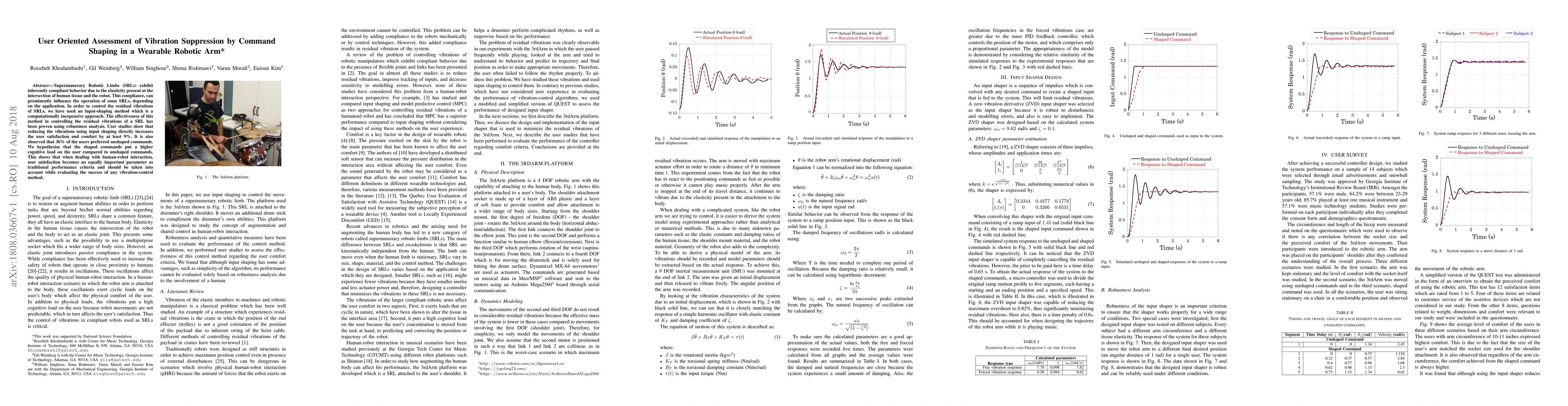 Supernumerary Robotic Limbs (SRLs) exhibit inherently compliant behavior due to the elasticity present at the intersection of human tissue and the robot. This compliance, can prominently influence the operation of some SRLs, depending on the application. In order to control the residual vibrations of SRLs, we have used an input-shaping method which is a computationally inexpensive approach. The effectiveness of this method in controlling the residual vibrations of a SRL has been proven using robustness analysis. User studies show that reducing the vibrations using input shaping directly increases the user satisfaction and comfort by at least 9%. It is also observed that 36% of the users preferred unshaped commands. We hypothesize that the shaped commands put a higher cognitive load on the user compared to unshaped commands. This shows that when dealing with human-robot interaction, user satisfaction becomes an equally important parameter as traditional performance criteria and should be taken into account while evaluating the success of any vibration-control method.