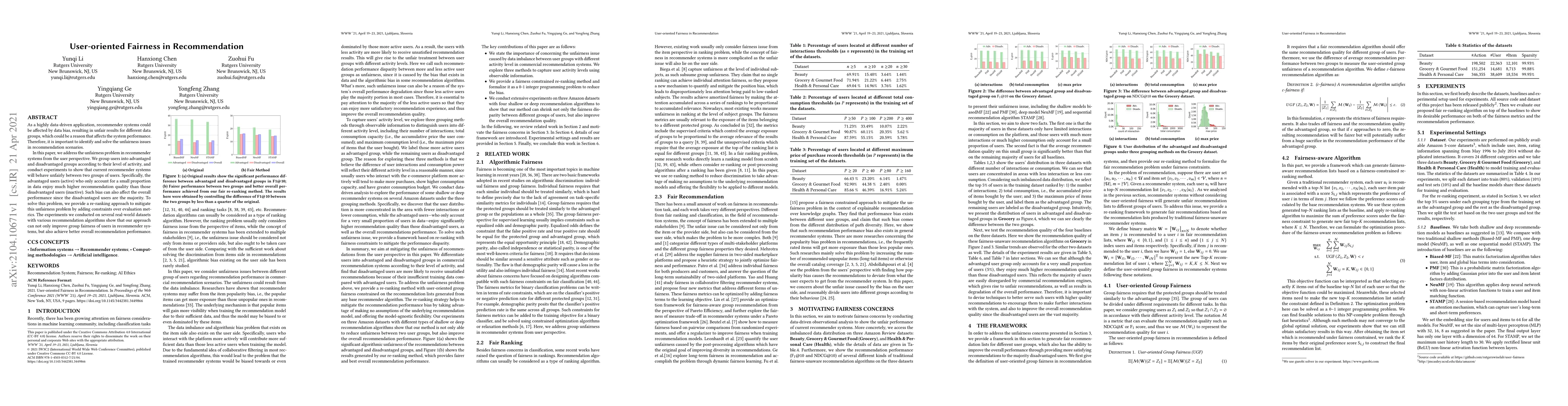 This paper investigates and addresses the unfairness in recommender systems from a user-oriented perspective, demonstrating that active users receive higher recommendation quality despite being a minority. It proposes a re-ranking approach with constraints to enhance fairness and overall performance, validated through experiments on real-world datasets.