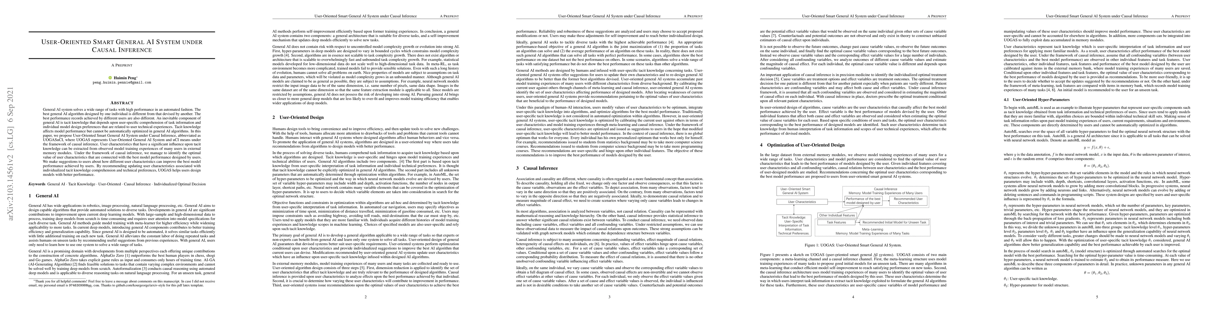 General AI system solves a wide range of tasks with high performance in an automated fashion. The best general AI algorithm designed by one individual is different from that devised by another. The best performance records achieved by different users are also different. An inevitable component of general AI is tacit knowledge that depends upon user-specific comprehension of task information and individual model design preferences that are related to user technical experiences. Tacit knowledge affects model performance but cannot be automatically optimized in general AI algorithms. In this paper, we propose User-Oriented Smart General AI System under Causal Inference, abbreviated as UOGASuCI, where UOGAS represents User-Oriented General AI System and uCI means under the framework of causal inference. User characteristics that have a significant influence upon tacit knowledge can be extracted from observed model training experiences of many users in external memory modules. Under the framework of causal inference, we manage to identify the optimal value of user characteristics that are connected with the best model performance designed by users. We make suggestions to users about how different user characteristics can improve the best model performance achieved by users. By recommending updating user characteristics associated with individualized tacit knowledge comprehension and technical preferences, UOGAS helps users design models with better performance.