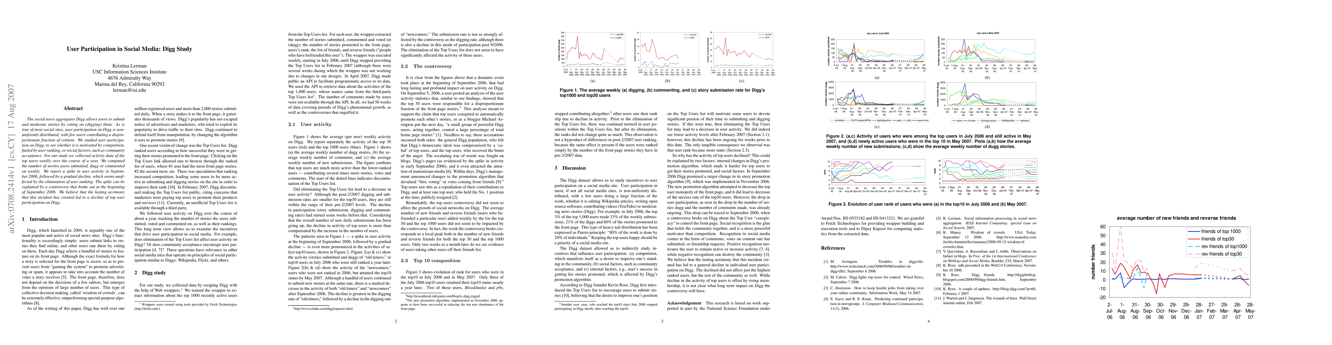 This study examines user participation on the social news site Digg, finding that a few users contribute disproportionately. A notable spike in activity in September 2006 followed by a decline was attributed to a controversy, suggesting that social factors and community dynamics significantly influence user engagement.