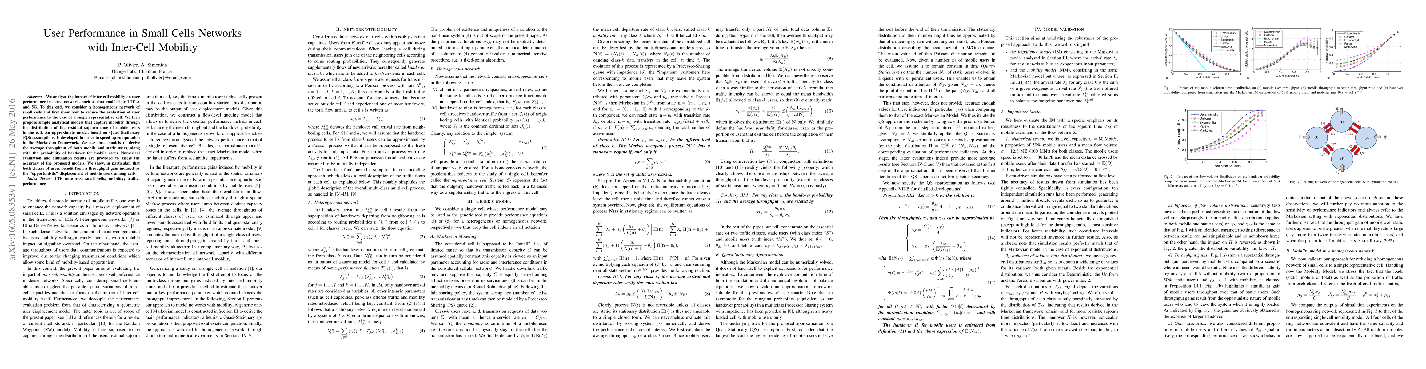 We analyze the impact of intra-cell mobility on user performance in dense networks such as that enabled by LTE-A and 5G. To this end, we consider a homogeneous network of small cells and first show how to reduce the evaluation of user performance to the case of a single representative cell. We then propose simple analytical models that capture mobility through the distribution of the residual sojourn time of mobile users in the cell. An approximate model, based on Quasi-Stationary (QS) assumptions, is developed in order to speed up computation in the Markovian framework. We use these models to derive the average throughput of both mobile and static users, along with the probability of handover for mobile users. Numerical evaluation and simulation results are provided to assess the accuracy of the proposed models. We show, in particular, that both classes of users benefit from a throughput gain induced by the "opportunistic" displacement of mobile users among cells.
