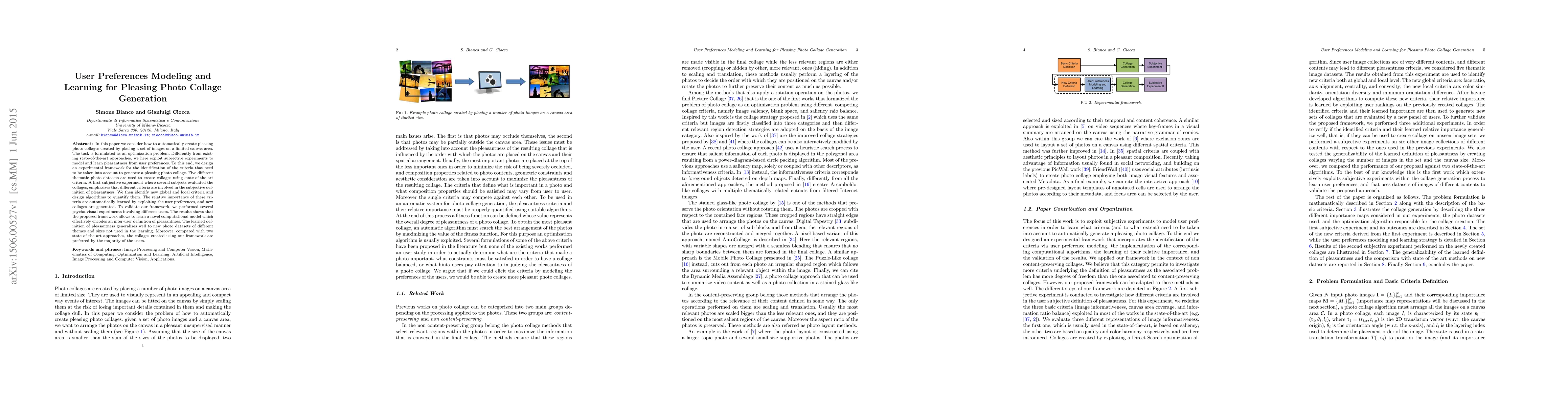 In this paper we consider how to automatically create pleasing photo collages created by placing a set of images on a limited canvas area. The task is formulated as an optimization problem. Differently from existing state-of-the-art approaches, we here exploit subjective experiments to model and learn pleasantness from user preferences. To this end, we design an experimental framework for the identification of the criteria that need to be taken into account to generate a pleasing photo collage. Five different thematic photo datasets are used to create collages using state-of-the-art criteria. A first subjective experiment where several subjects evaluated the collages, emphasizes that different criteria are involved in the subjective definition of pleasantness. We then identify new global and local criteria and design algorithms to quantify them. The relative importance of these criteria are automatically learned by exploiting the user preferences, and new collages are generated. To validate our framework, we performed several psycho-visual experiments involving different users. The results shows that the proposed framework allows to learn a novel computational model which effectively encodes an inter-user definition of pleasantness. The learned definition of pleasantness generalizes well to new photo datasets of different themes and sizes not used in the learning. Moreover, compared with two state of the art approaches, the collages created using our framework are preferred by the majority of the users.