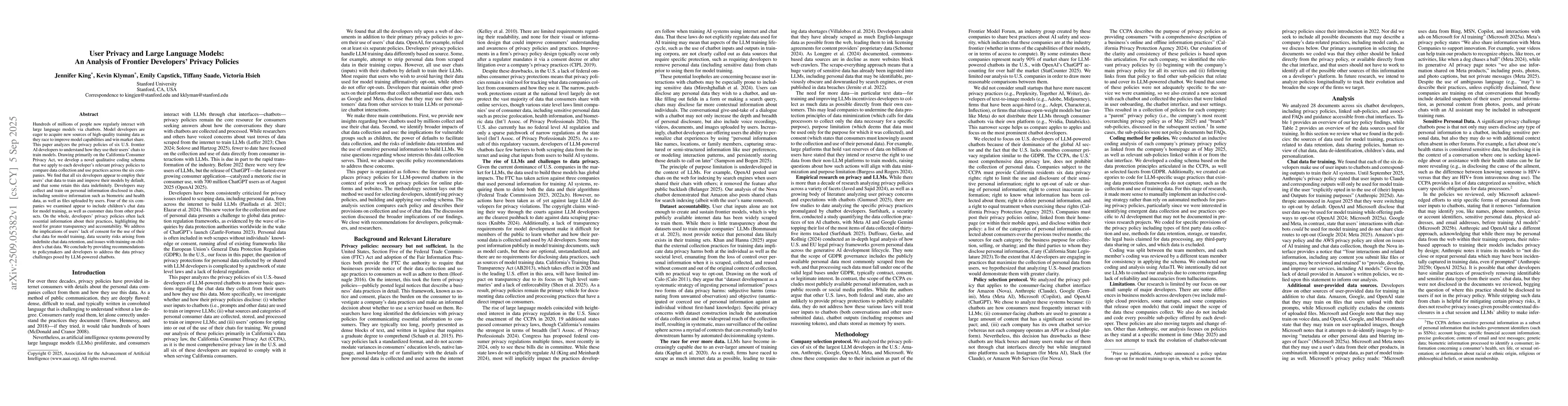 Hundreds of millions of people now regularly interact with large language models via chatbots. Model developers are eager to acquire new sources of high-quality training data as they race to improve model capabilities and win market share. This paper analyzes the privacy policies of six U.S. frontier AI developers to understand how they use their users' chats to train models. Drawing primarily on the California Consumer Privacy Act, we develop a novel qualitative coding schema that we apply to each developer's relevant privacy policies to compare data collection and use practices across the six companies. We find that all six developers appear to employ their users' chat data to train and improve their models by default, and that some retain this data indefinitely. Developers may collect and train on personal information disclosed in chats, including sensitive information such as biometric and health data, as well as files uploaded by users. Four of the six companies we examined appear to include children's chat data for model training, as well as customer data from other products. On the whole, developers' privacy policies often lack essential information about their practices, highlighting the need for greater transparency and accountability. We address the implications of users' lack of consent for the use of their chat data for model training, data security issues arising from indefinite chat data retention, and training on children's chat data. We conclude by providing recommendations to policymakers and developers to address the data privacy challenges posed by LLM-powered chatbots.