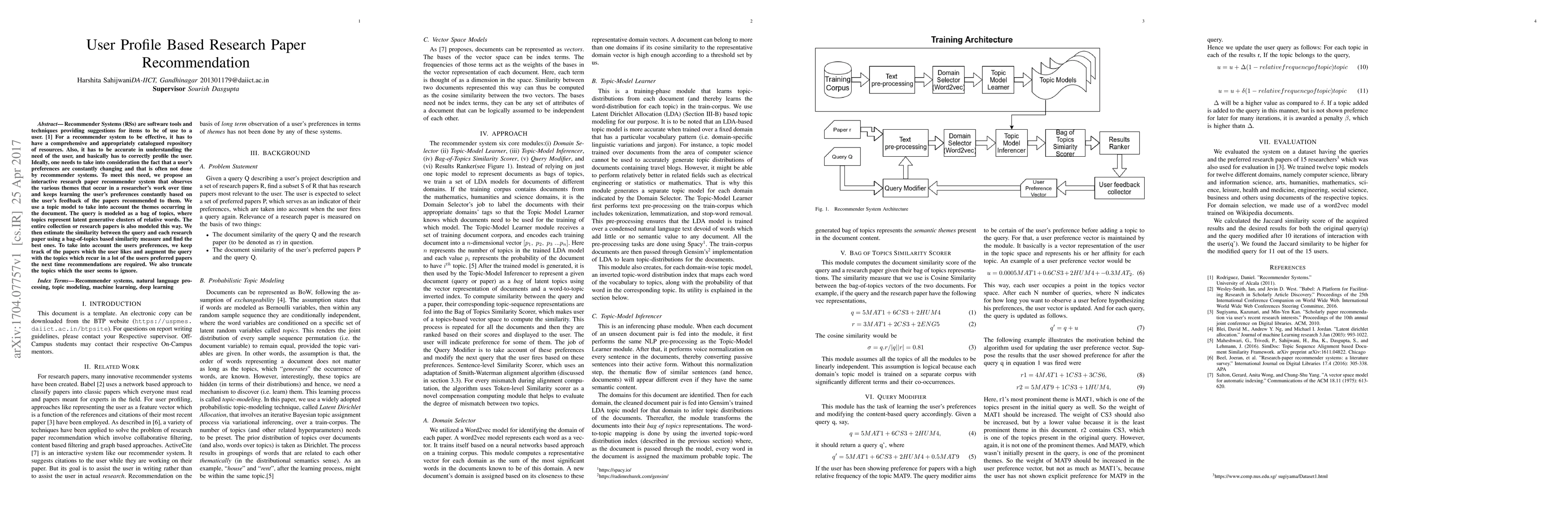 We design a recommender system for research papers based on topic-modeling. The users feedback to the results is used to make the results more relevant the next time they fire a query. The user's needs are understood by observing the change in the themes that the user shows a preference for over time.