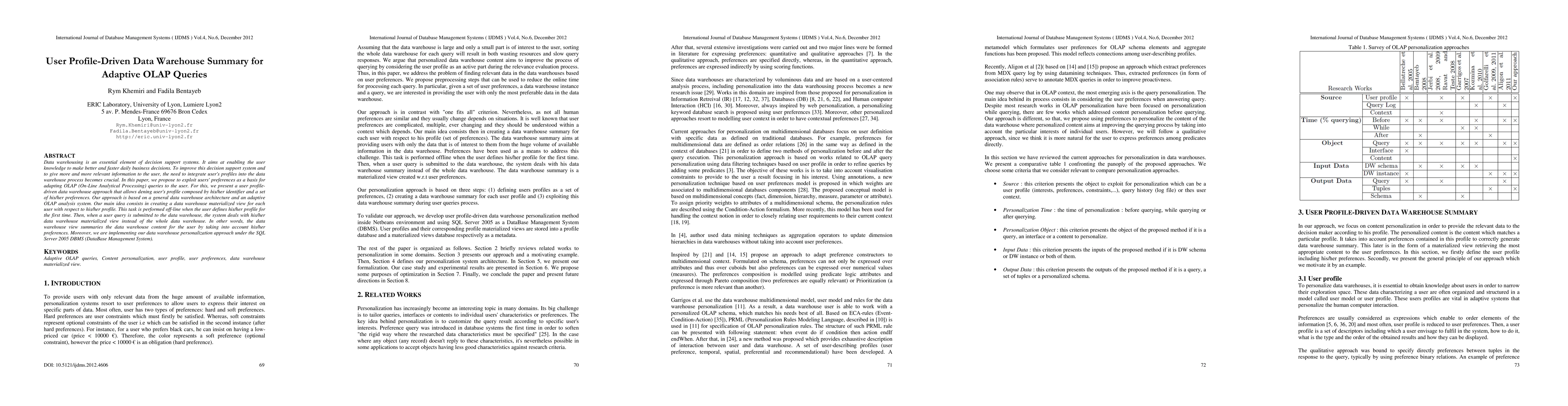 This paper proposes a user profile-driven data warehouse approach to enhance OLAP queries by adapting them to individual user preferences. The system creates a personalized materialized view for each user based on their profile, improving the relevance and efficiency of query results.