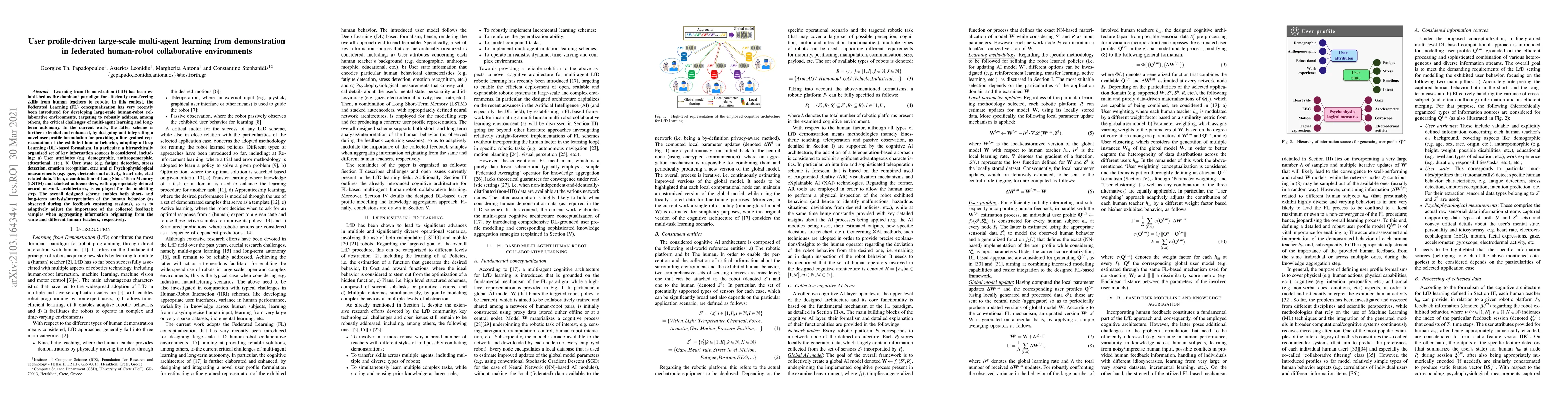Learning from Demonstration (LfD) has been established as the dominant paradigm for efficiently transferring skills from human teachers to robots. In this context, the Federated Learning (FL) conceptualization has very recently been introduced for developing large-scale human-robot collaborative environments, targeting to robustly address, among others, the critical challenges of multi-agent learning and long-term autonomy. In the current work, the latter scheme is further extended and enhanced, by designing and integrating a novel user profile formulation for providing a fine-grained representation of the exhibited human behavior, adopting a Deep Learning (DL)-based formalism. In particular, a hierarchically organized set of key information sources is considered, including: a) User attributes (e.g. demographic, anthropomorphic, educational, etc.), b) User state (e.g. fatigue detection, stress detection, emotion recognition, etc.) and c) Psychophysiological measurements (e.g. gaze, electrodermal activity, heart rate, etc.) related data. Then, a combination of Long Short-Term Memory (LSTM) and stacked autoencoders, with appropriately defined neural network architectures, is employed for the modelling step. The overall designed scheme enables both short- and long-term analysis/interpretation of the human behavior (as observed during the feedback capturing sessions), so as to adaptively adjust the importance of the collected feedback samples when aggregating information originating from the same and different human teachers, respectively.
