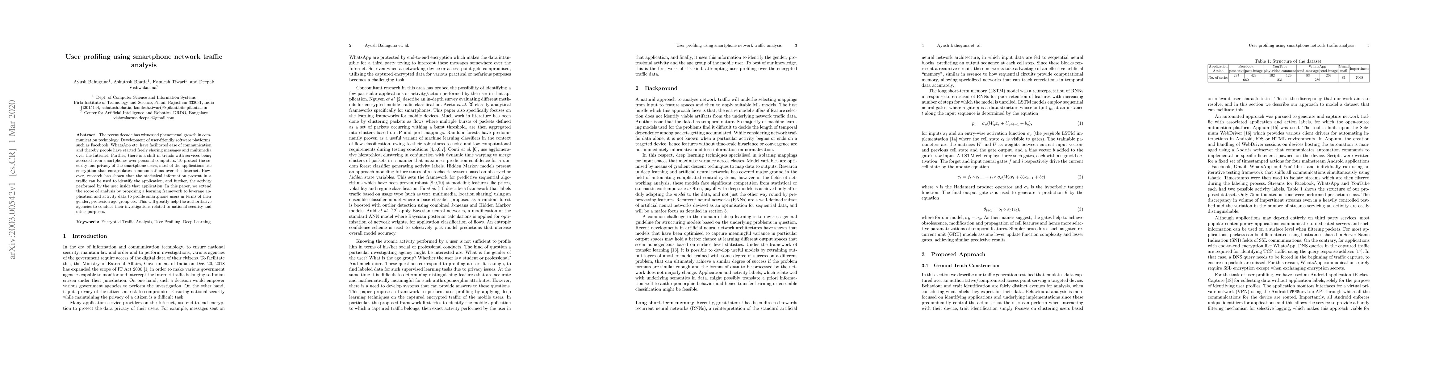 The recent decade has witnessed phenomenal growth in communication technology. Development of user-friendly software platforms, such as Facebook, WhatsApp etc. have facilitated ease of communication and thereby people have started freely sharing messages and multimedia over the Internet. Further, there is a shift in trends with services being accessed from smartphones over personal computers. To protect the security and privacy of the smartphone users, most of the applications use encryption that encapsulates communications over the Internet. However, research has shown that the statistical information present in a traffic can be used to identify the application, and further, the activity performed by the user inside that application. In this paper, we extend the scope of analysis by proposing a learning framework to leverage application and activity data to profile smartphone users in terms of their gender, profession age group etc. This will greatly help the authoritative agencies to conduct their investigations related to national security and other purposes.