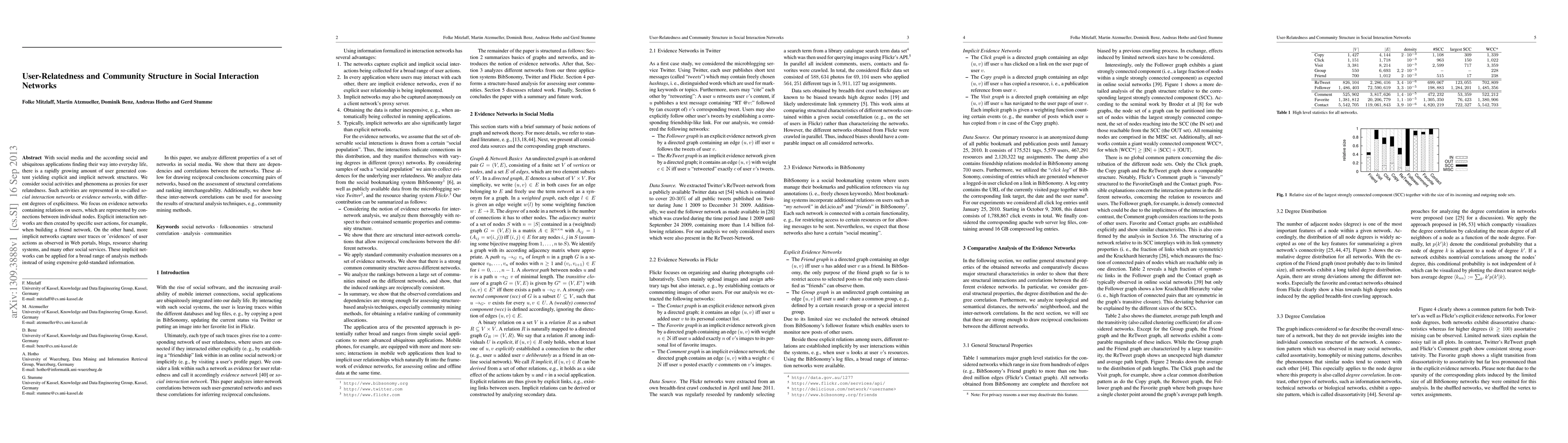 With social media and the according social and ubiquitous applications finding their way into everyday life, there is a rapidly growing amount of user generated content yielding explicit and implicit network structures. We consider social activities and phenomena as proxies for user relatedness. Such activities are represented in so-called social interaction networks or evidence networks, with different degrees of explicitness. We focus on evidence networks containing relations on users, which are represented by connections between individual nodes. Explicit interaction networks are then created by specific user actions, for example, when building a friend network. On the other hand, more implicit networks capture user traces or evidences of user actions as observed in Web portals, blogs, resource sharing systems, and many other social services. These implicit networks can be applied for a broad range of analysis methods instead of using expensive gold-standard information. In this paper, we analyze different properties of a set of networks in social media. We show that there are dependencies and correlations between the networks. These allow for drawing reciprocal conclusions concerning pairs of networks, based on the assessment of structural correlations and ranking interchangeability. Additionally, we show how these inter-network correlations can be used for assessing the results of structural analysis techniques, e.g., community mining methods.