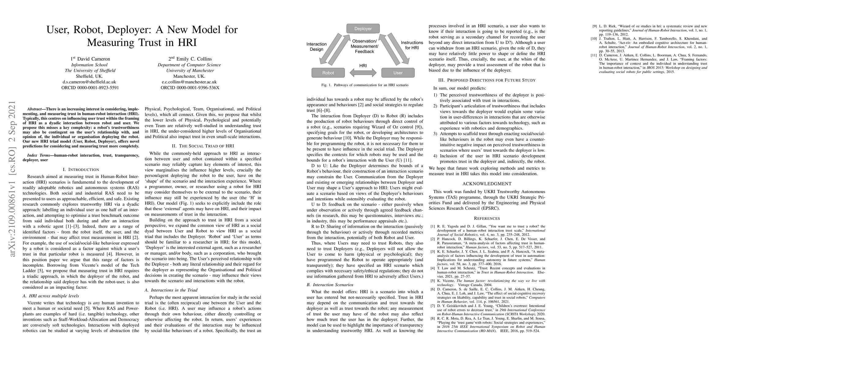 This paper proposes a new HRI triad model that considers trust not just between the user and robot, but also includes the deployer's influence on user trust. This model aims to provide a more comprehensive framework for measuring trust in human-robot interactions.