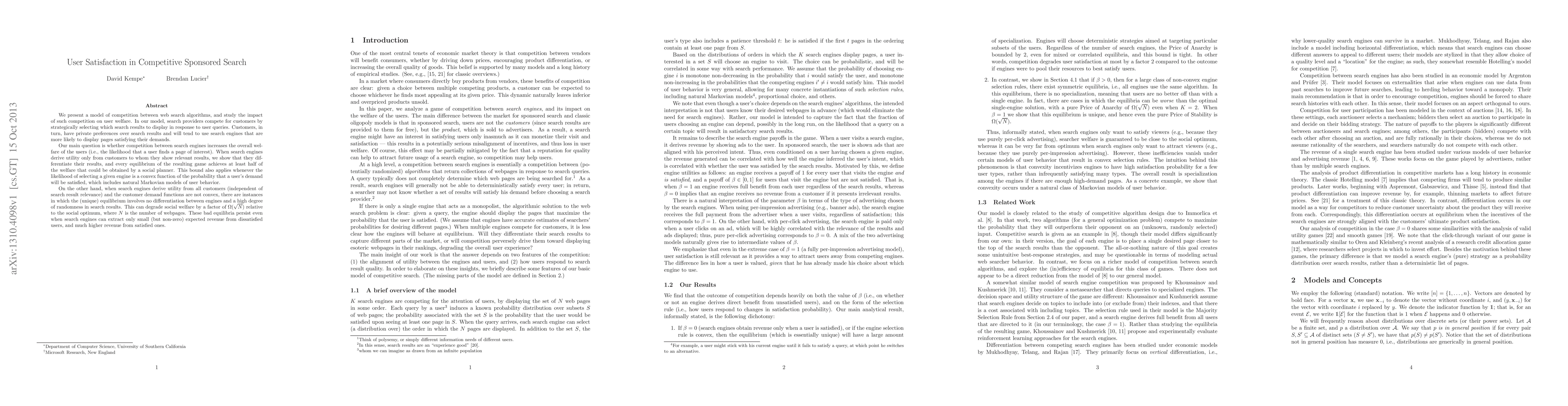 We present a model of competition between web search algorithms, and study the impact of such competition on user welfare. In our model, search providers compete for customers by strategically selecting which search results to display in response to user queries. Customers, in turn, have private preferences over search results and will tend to use search engines that are more likely to display pages satisfying their demands. Our main question is whether competition between search engines increases the overall welfare of the users (i.e., the likelihood that a user finds a page of interest). When search engines derive utility only from customers to whom they show relevant results, we show that they differentiate their results, and every equilibrium of the resulting game achieves at least half of the welfare that could be obtained by a social planner. This bound also applies whenever the likelihood of selecting a given engine is a convex function of the probability that a user's demand will be satisfied, which includes natural Markovian models of user behavior. On the other hand, when search engines derive utility from all customers (independent of search result relevance) and the customer demand functions are not convex, there are instances in which the (unique) equilibrium involves no differentiation between engines and a high degree of randomness in search results. This can degrade social welfare by a factor of the square root of N relative to the social optimum, where N is the number of webpages. These bad equilibria persist even when search engines can extract only small (but non-zero) expected revenue from dissatisfied users, and much higher revenue from satisfied ones.