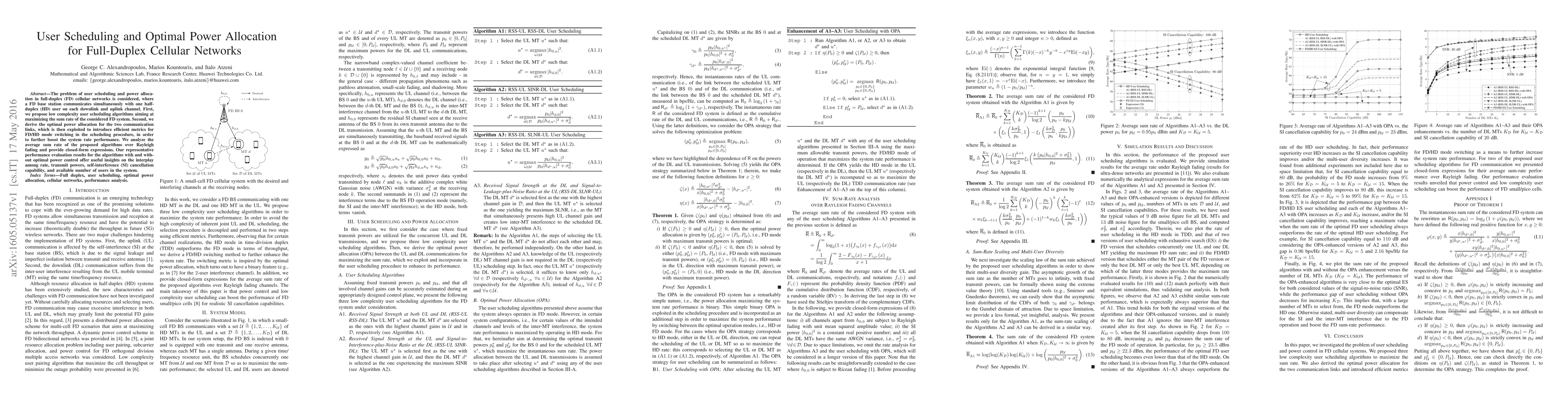 This paper proposes low complexity user scheduling algorithms to maximize the sum rate in full-duplex cellular networks, where a base station communicates with half-duplex users. It also derives optimal power allocation for both communication links and introduces efficient metrics for switching between full-duplex and half-duplex modes to enhance system performance.