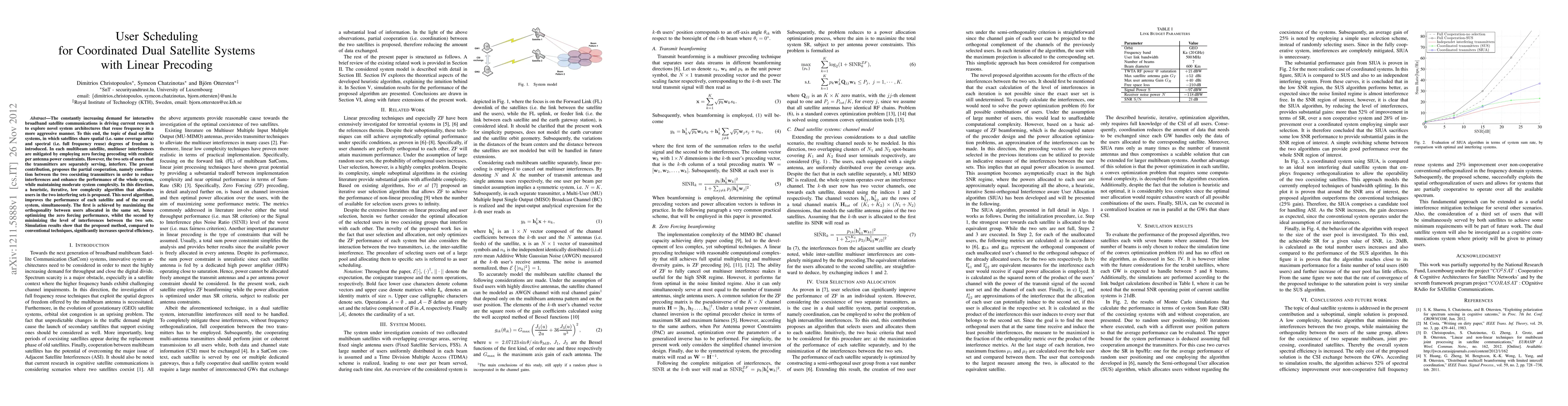 The constantly increasing demand for interactive broadband satellite communications is driving current research to explore novel system architectures that reuse frequency in a more aggressive manner. To this end, the topic of dual satellite systems, in which satellites share spatial (i.e. same coverage area) and spectral (i.e. full frequency reuse) degrees of freedom is introduced. In each multibeam satellite, multiuser interferences are mitigated by employing zero forcing precoding with realistic per antenna power constraints. However, the two sets of users that the transmitters are separately serving, interfere. The present contribution, proposes the partial cooperation, namely coordination between the two coexisting transmitters in order to reduce interferences and enhance the performance of the whole system, while maintaining moderate system complexity. In this direction, a heuristic, iterative, low complexity algorithm that allocates users in the two interfering sets is proposed. This novel algorithm, improves the performance of each satellite and of the overall system, simultaneously. The first is achieved by maximizing the orthogonality between users allocated in the same set, hence optimizing the zero forcing performance, whilst the second by minimizing the level of interferences between the two sets. Simulation results show that the proposed method, compared to conventional techniques, significantly increases spectral efficiency.