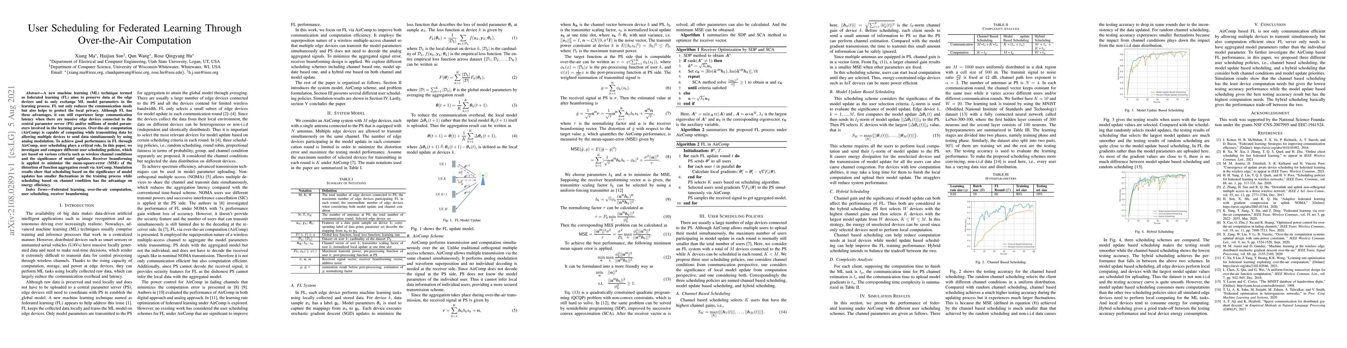 A new machine learning (ML) technique termed as federated learning (FL) aims to preserve data at the edge devices and to only exchange ML model parameters in the learning process. FL not only reduces the communication needs but also helps to protect the local privacy. Although FL has these advantages, it can still experience large communication latency when there are massive edge devices connected to the central parameter server (PS) and/or millions of model parameters involved in the learning process. Over-the-air computation (AirComp) is capable of computing while transmitting data by allowing multiple devices to send data simultaneously by using analog modulation. To achieve good performance in FL through AirComp, user scheduling plays a critical role. In this paper, we investigate and compare different user scheduling policies, which are based on various criteria such as wireless channel conditions and the significance of model updates. Receiver beamforming is applied to minimize the mean-square-error (MSE) of the distortion of function aggregation result via AirComp. Simulation results show that scheduling based on the significance of model updates has smaller fluctuations in the training process while scheduling based on channel condition has the advantage on energy efficiency.