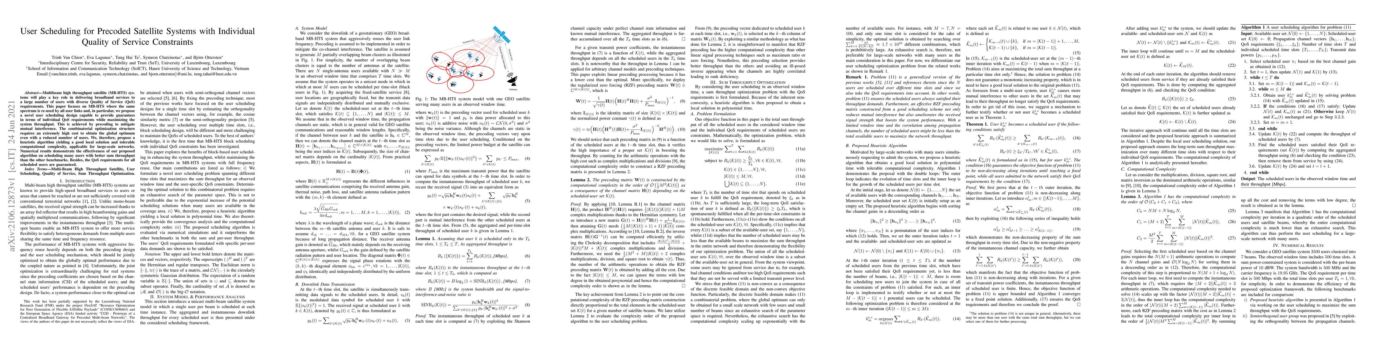 A new user scheduling algorithm is proposed for multibeam high throughput satellite systems to ensure individual Quality of Service requirements while maximizing system throughput.