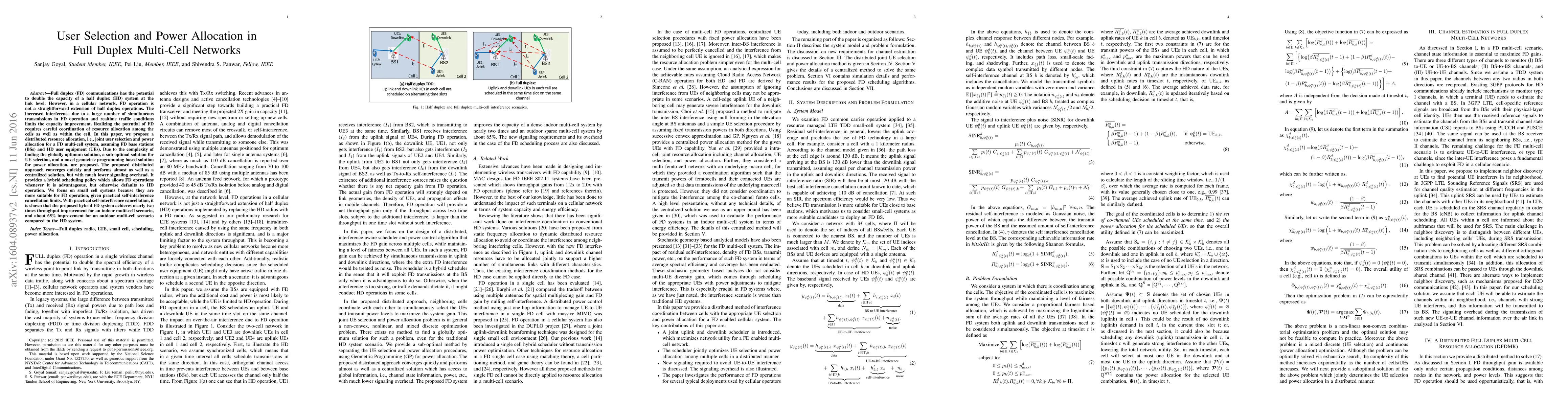 This paper proposes a distributed resource allocation strategy for full duplex (FD) multi-cell networks, focusing on joint user selection and power allocation to maximize throughput. The approach leverages a sub-optimal UE selection and a geometric programming-based power allocation, achieving nearly two times throughput improvement indoors and about 65% improvement outdoors compared to half duplex systems.