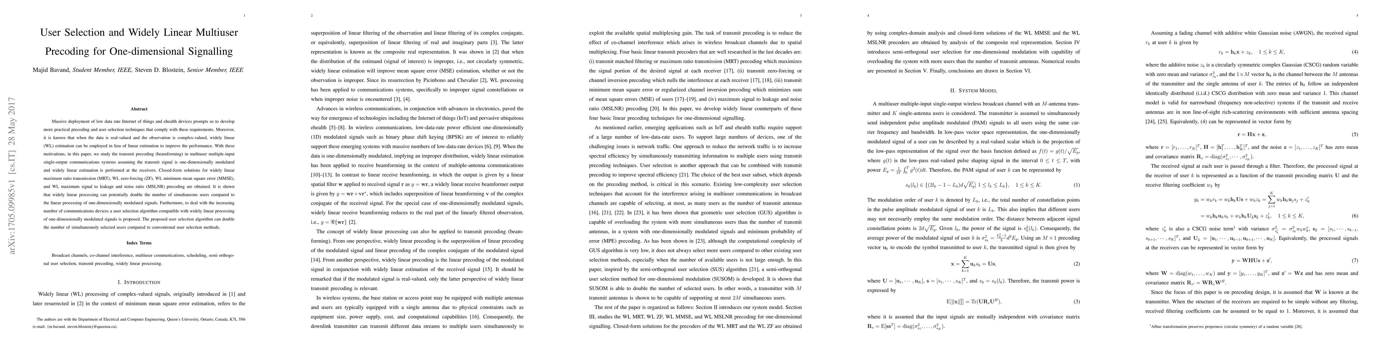 Massive deployment of low data rate Internet of things and ehealth devices prompts us to develop more practical precoding and user selection techniques that comply with these requirements. Moreover, it is known that when the data is real-valued and the observation is complex-valued, widely linear (WL) estimation can be employed in lieu of linear estimation to improve the performance. With these motivations, in this paper, we study the transmit precoding (beamforming) in multiuser multiple-input single-output communications systems assuming the transmit signal is one-dimensionally modulated and widely linear estimation is performed at the receivers. Closed-form solutions for widely linear maximum ratio transmission (MRT), WL zero-forcing (ZF), WL minimum mean square error (MMSE), and WL maximum signal to leakage and noise ratio (MSLNR) precoding are obtained. It is shown that widely linear processing can potentially double the number of simultaneous users compared to the linear processing of one-dimensionally modulated signals. Furthermore, to deal with the increasing number of communications devices a user selection algorithm compatible with widely linear processing of one-dimensionally modulated signals is proposed. The proposed user selection algorithm can double the number of simultaneously selected users compared to conventional user selection methods.
