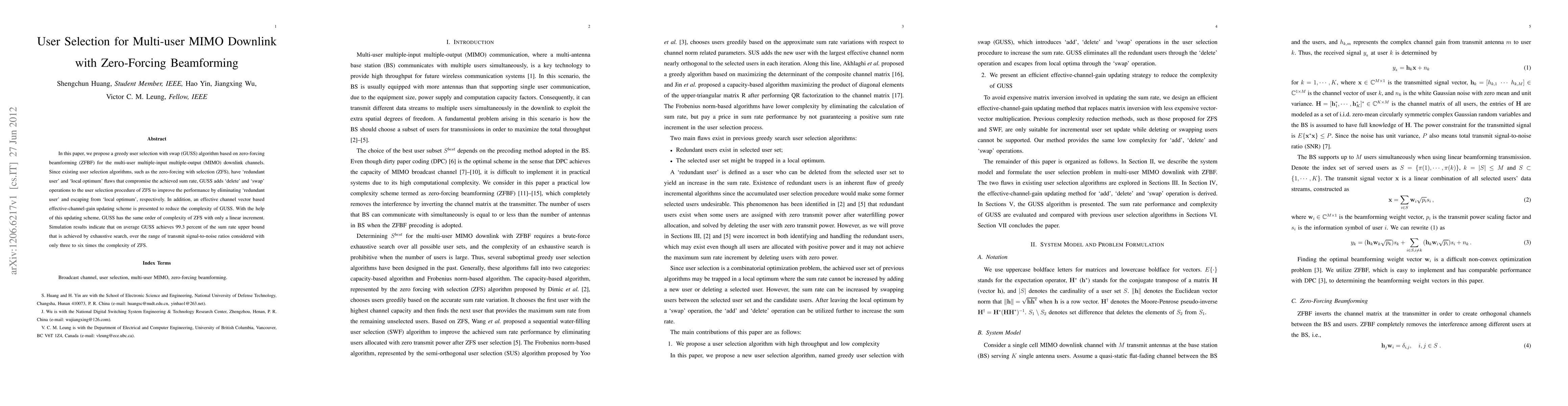 This paper proposes a GUSS algorithm for multi-user MIMO downlink channels using zero-forcing beamforming, addressing flaws in existing algorithms like ZFS by incorporating delete and swap operations to enhance sum rate. An effective channel vector gain updating scheme reduces GUSS complexity, achieving nearly optimal sum rate with manageable complexity.