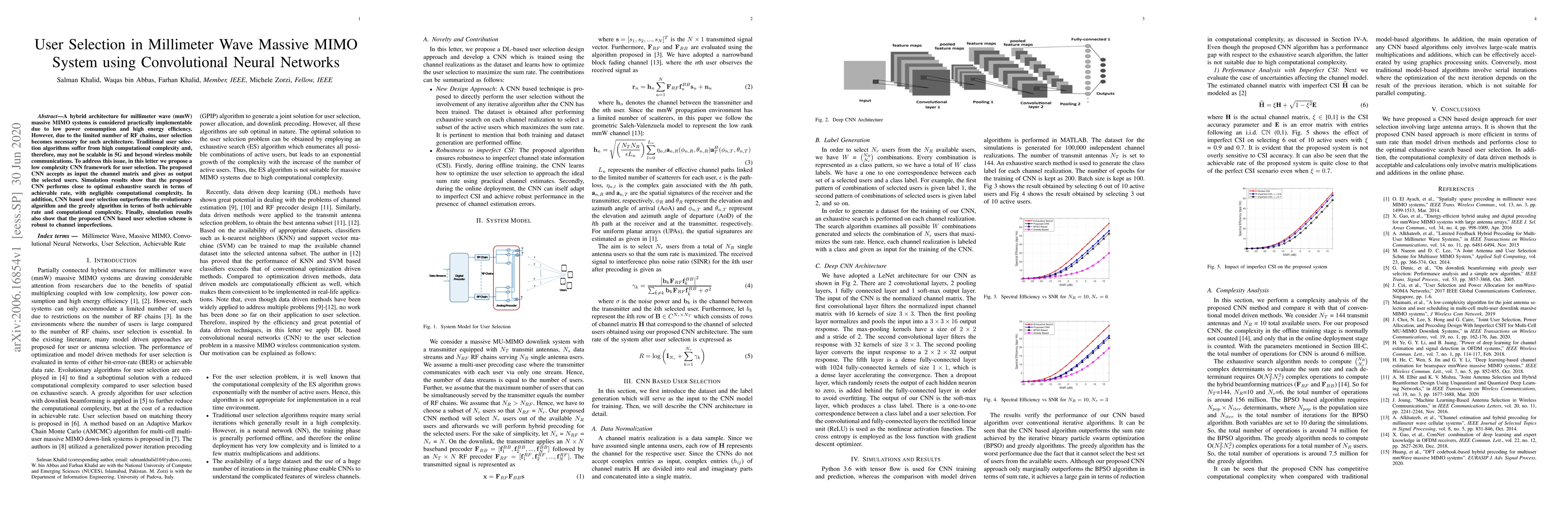 A hybrid architecture for millimeter wave (mmW) massive MIMO systems is considered practically implementable due to low power consumption and high energy efficiency. However, due to the limited number of RF chains, user selection becomes necessary for such architecture. Traditional user selection algorithms suffer from high computational complexity and, therefore, may not be scalable in 5G and beyond wireless mobile communications. To address this issue, in this letter we propose a low complexity CNN framework for user selection. The proposed CNN accepts as input the channel matrix and gives as output the selected users. Simulation results show that the proposed CNN performs close to optimal exhaustive search in terms of achievable rate, with negligible computational complexity. In addition, CNN based user selection outperforms the evolutionary algorithm and the greedy algorithm in terms of both achievable rate and computational complexity. Finally, simulation results also show that the proposed CNN based user selection scheme is robust to channel imperfections.