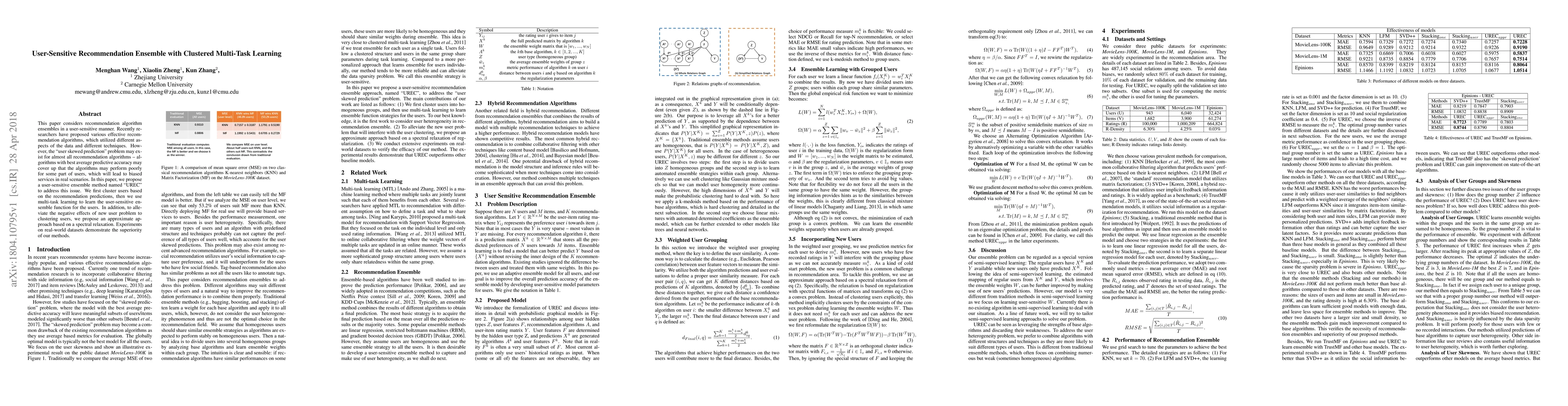 The paper introduces UREC, a user-sensitive ensemble method addressing the 'user skewed prediction' problem in recommendation algorithms. UREC clusters users based on predictions and uses multi-task learning for a user-sensitive ensemble function. It also proposes an approximate approach using spectral relaxation for the new user problem, demonstrating superior performance on real-world datasets.