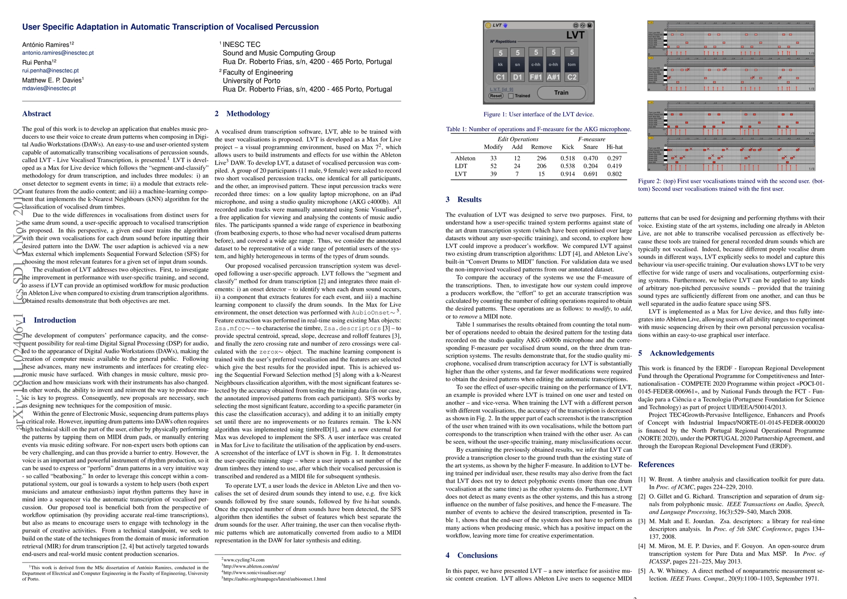 The goal of this work is to develop an application that enables music producers to use their voice to create drum patterns when composing in Digital Audio Workstations (DAWs). An easy-to-use and user-oriented system capable of automatically transcribing vocalisations of percussion sounds, called LVT - Live Vocalised Transcription, is presented. LVT is developed as a Max for Live device which follows the `segment-and-classify' methodology for drum transcription, and includes three modules: i) an onset detector to segment events in time; ii) a module that extracts relevant features from the audio content; and iii) a machine-learning component that implements the k-Nearest Neighbours (kNN) algorithm for the classification of vocalised drum timbres. Due to the wide differences in vocalisations from distinct users for the same drum sound, a user-specific approach to vocalised transcription is proposed. In this perspective, a given end-user trains the algorithm with their own vocalisations for each drum sound before inputting their desired pattern into the DAW. The user adaption is achieved via a new Max external which implements Sequential Forward Selection (SFS) for choosing the most relevant features for a given set of input drum sounds.