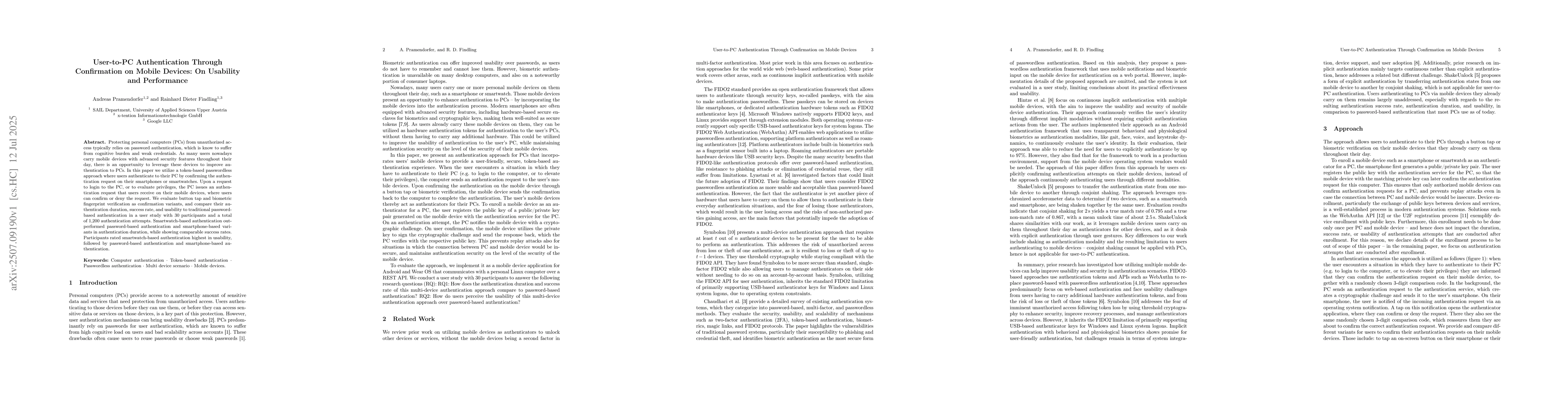 This work contributes to the field of user authentication by exploring confirmation on mobile devices and its potential benefits for PC authentication