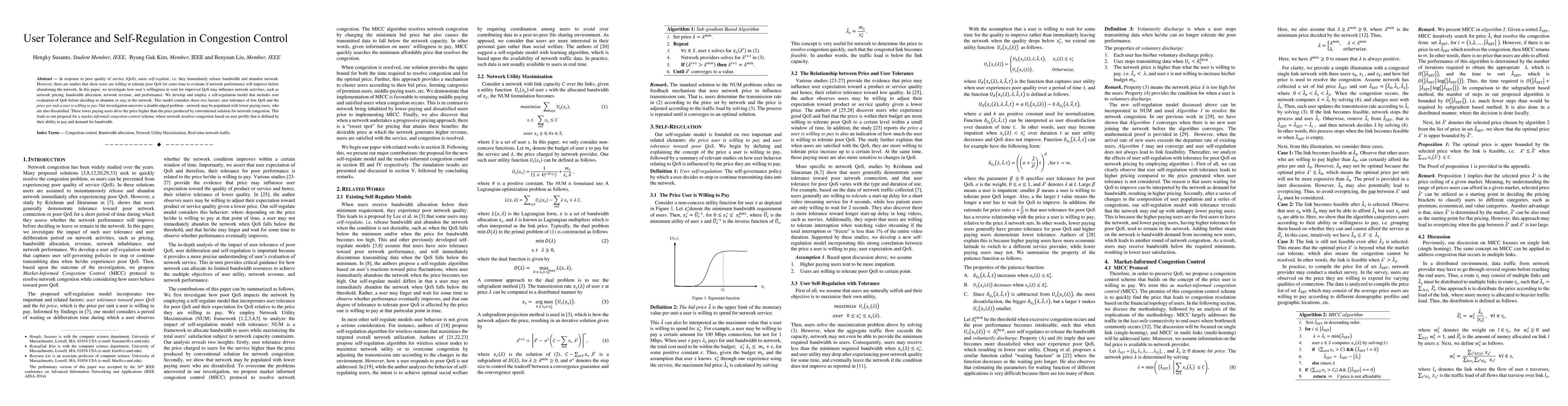 In response to poor quality of service (QoS), users self-regulate, i.e. they immediately release bandwidth and abandon network. However, there are studies that show users are willing to tolerate poor QoS for some time to evaluate if network performance will improve before abandoning the network. In this paper, we investigate how users willingness to wait for improved QoS may influence network activities, such as network pricing, bandwidth allocation, network revenue, and performance. We develop and employ a self-regulation model that includes user evaluation of QoS before deciding to abandon or stay in the network. This model considers these two factors: user tolerance of low QoS and the price per unit a user is willing to pay. Our investigation uncovers a double edged problem network may be populated with lower paying users, who are also dissatisfied. These lower paying users drive the price higher than the price produced by conventional solution for network congestion. This leads to our proposal for a market informed congestion control scheme, where network resolves congestion based on user profile that is defined by their ability to pay and demand for bandwidth.