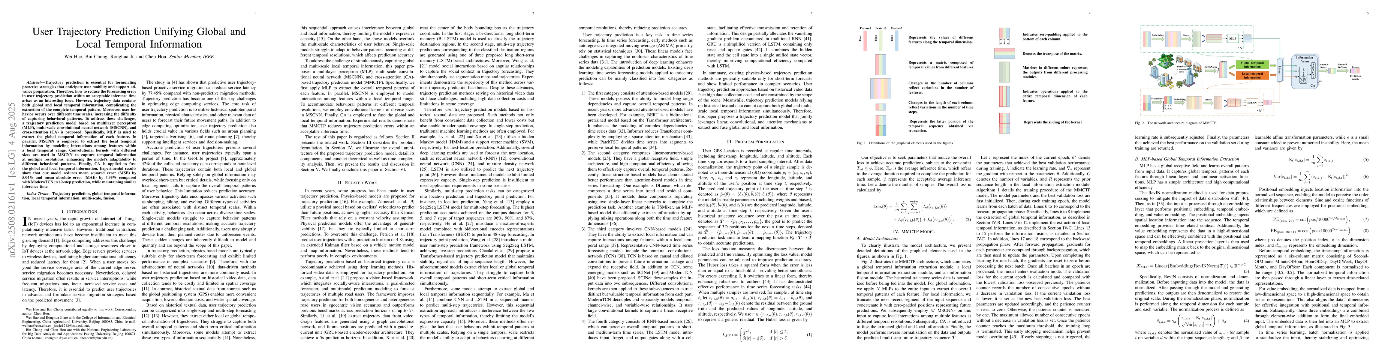 Trajectory prediction is essential for formulating proactive strategies that anticipate user mobility and support advance preparation. Therefore, how to reduce the forecasting error in user trajectory prediction within an acceptable inference time arises as an interesting issue. However, trajectory data contains both global and local temporal information, complicating the extraction of the complete temporal pattern. Moreover, user behavior occurs over different time scales, increasing the difficulty of capturing behavioral patterns. To address these challenges, a trajectory prediction model based on multilayer perceptron (MLP), multi-scale convolutional neural network (MSCNN), and cross-attention (CA) is proposed. Specifically, MLP is used to extract the global temporal information of each feature. In parallel, MSCNN is employed to extract the local temporal information by modeling interactions among features within a local temporal range. Convolutional kernels with different sizes are used in MSCNN to capture temporal information at multiple resolutions, enhancing the model's adaptability to different behavioral patterns. Finally, CA is applied to fuse the global and local temporal information. Experimental results show that our model reduces mean squared error (MSE) by 5.04% and mean absolute error (MAE) by 4.35% compared with ModernTCN in 12-step prediction, while maintaining similar inference time.