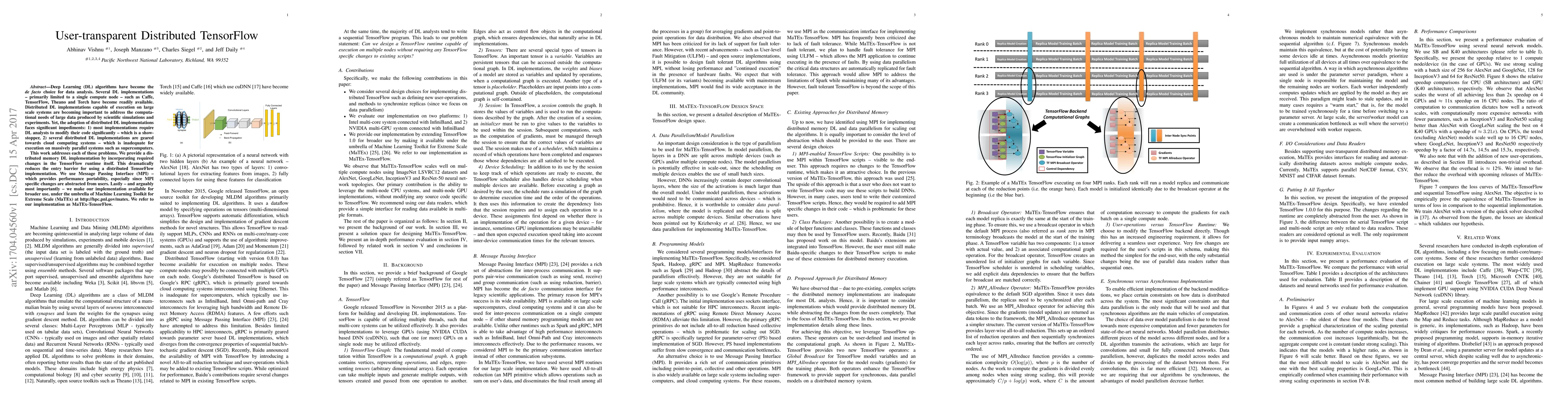 This paper presents a user-transparent distributed TensorFlow implementation that reduces the entry barrier for distributed deep learning by minimizing code modifications and leveraging MPI for performance portability. The implementation is part of the Machine Learning Toolkit for Extreme Scale (MaTEx) and is designed to work on massively parallel systems like supercomputers.