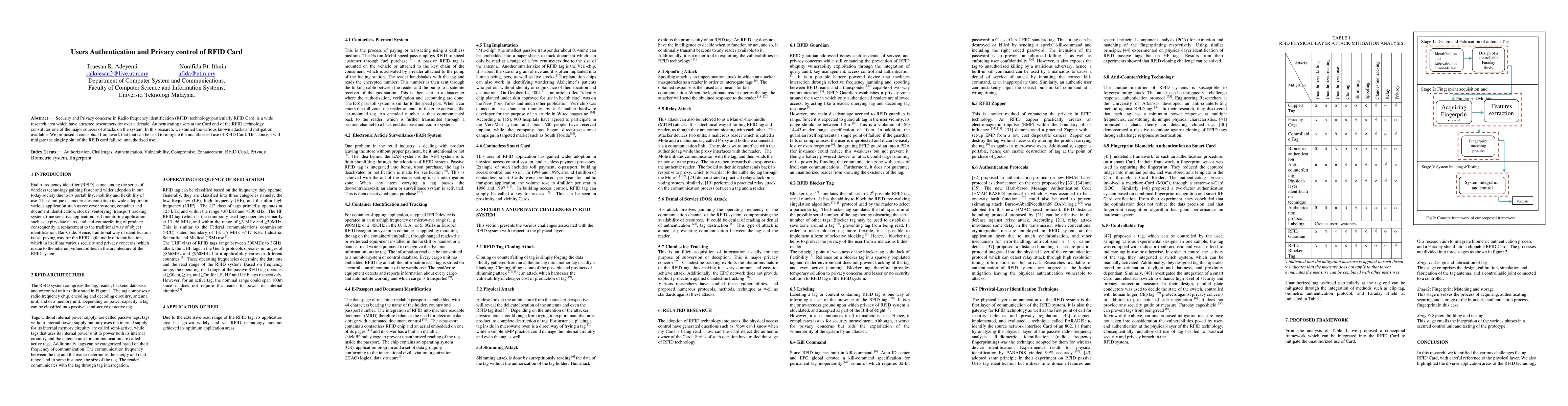 This paper investigates security and privacy issues in RFID Card technology, focusing on user authentication and unauthorized access. It proposes a conceptual framework to mitigate attacks and enhance privacy control, aiming to address the single point of failure in unauthorized RFID Card usage.