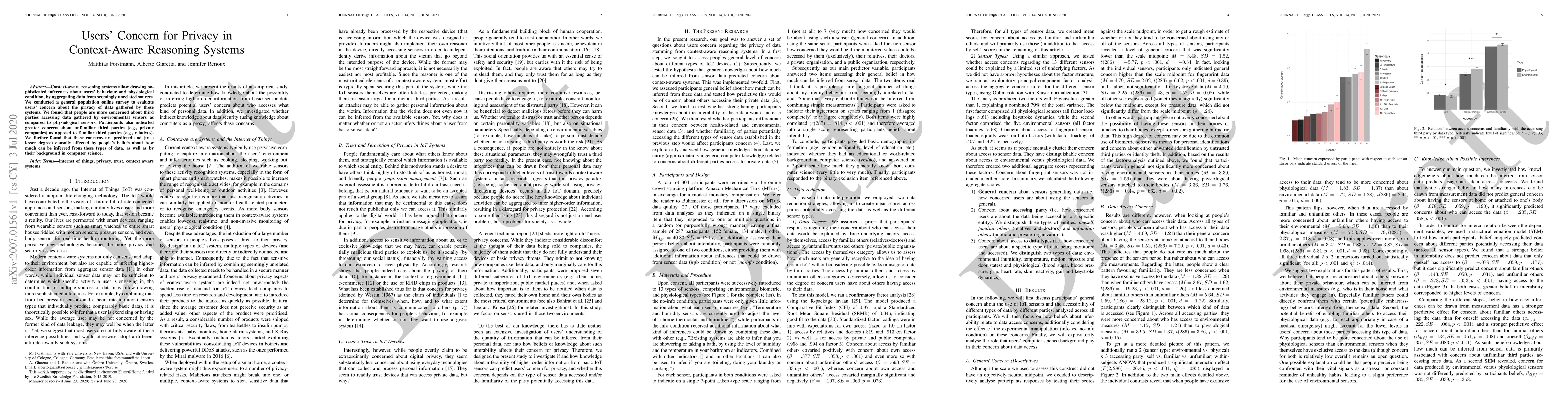Context-aware reasoning systems allow drawing sophisticated inferences about users' behaviour and physiological condition, by aggregating data from seemingly unrelated sources. We conducted a general population online survey to evaluate users' concern about the privacy of data gathered by these systems. We found that people are more concerned about third parties accessing data gathered by environmental sensors as compared to physiological sensors. Participants also indicated greater concern about unfamiliar third parties (e.g., private companies) as opposed to familiar third parties (e.g., relatives). We further found that these concerns are predicted and (to a lesser degree) causally affected by people's beliefs about how much can be inferred from these types of data, as well as by their background in computer science.
