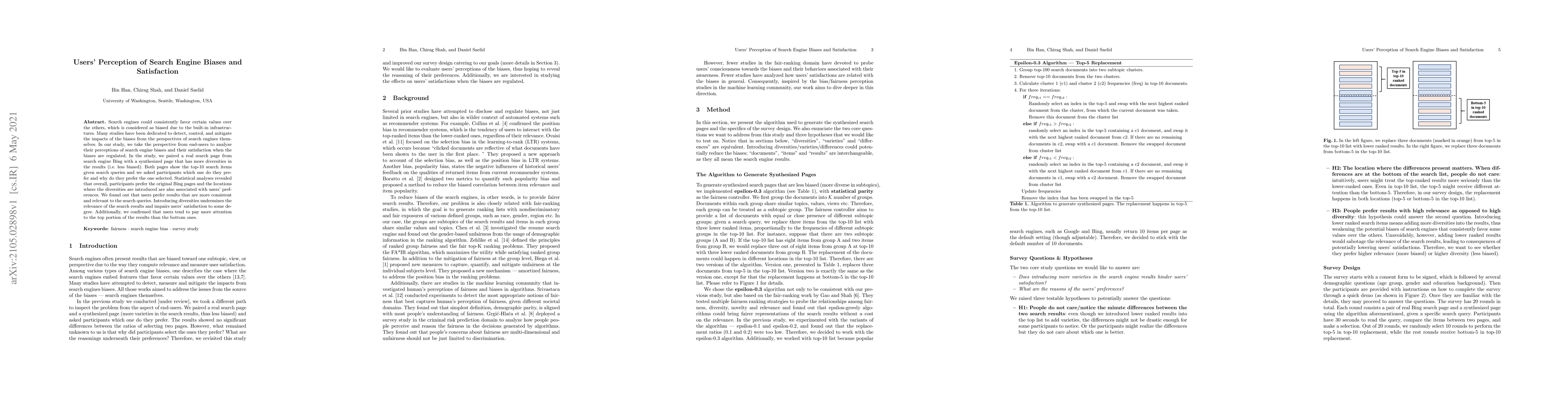 Search engines could consistently favor certain values over the others, which is considered as biased due to the built-in infrastructures. Many studies have been dedicated to detect, control, and mitigate the impacts of the biases from the perspectives of search engines themselves. In our study, we take the perspective from end-users to analyze their perceptions of search engine biases and their satisfaction when the biases are regulated. In the study, we paired a real search page from search engine Bing with a synthesized page that has more diversities in the results (i.e. less biased). Both pages show the top-10 search items given search queries and we asked participants which one do they prefer and why do they prefer the one selected. Statistical analyses revealed that overall, participants prefer the original Bing pages and the locations where the diversities are introduced are also associated with users' preferences. We found out that users prefer results that are more consistent and relevant to the search queries. Introducing diversities undermines the relevance of the search results and impairs users' satisfaction to some degree. Additionally, we confirmed that users tend to pay more attention to the top portion of the results than the bottom ones.