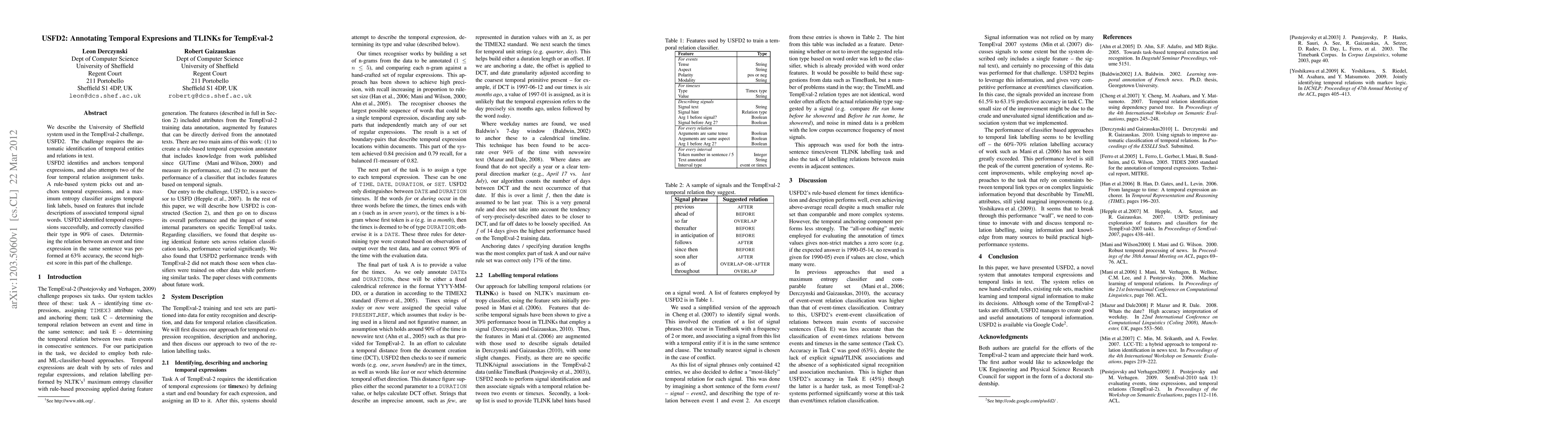 We describe the University of Sheffield system used in the TempEval-2 challenge, USFD2. The challenge requires the automatic identification of temporal entities and relations in text. USFD2 identifies and anchors temporal expressions, and also attempts two of the four temporal relation assignment tasks. A rule-based system picks out and anchors temporal expressions, and a maximum entropy classifier assigns temporal link labels, based on features that include descriptions of associated temporal signal words. USFD2 identified temporal expressions successfully, and correctly classified their type in 90% of cases. Determining the relation between an event and time expression in the same sentence was performed at 63% accuracy, the second highest score in this part of the challenge.